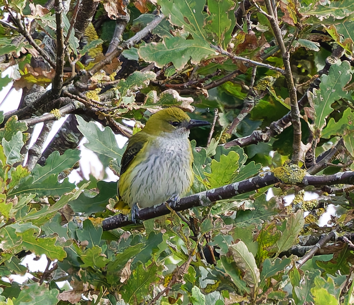 Beskrivelse: På en dejlig solskinsdag på Æbelø fløj pirolerne forbi i hastigt tempo flere gange - og et par timers tålmodighed blev belønnet med en restende fugl, som kunne fotograferes på nogen afstand - meget passende godt gemt mellem bladene.