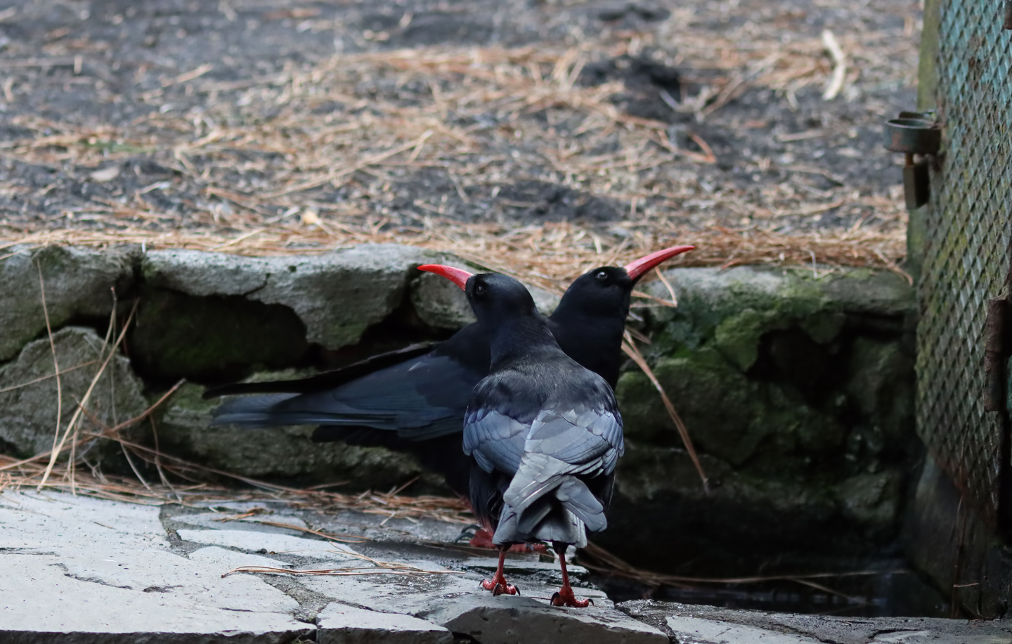 Når resterne er søbet op, tilbragte alpekragerne tid med tiltrængt fjerpleje (når rester endelig smides ud på landet hernede kan man være sikker på at holdbarhedsdatoen forlængst er overskredet... og derfor temmelig ildelugtende) eller også var de nede ved hundenes madskåle og lede efter rester; iøvrigt ganske morsomt at se dem narre hunden væk og så ellers stille sig op midt i maden.