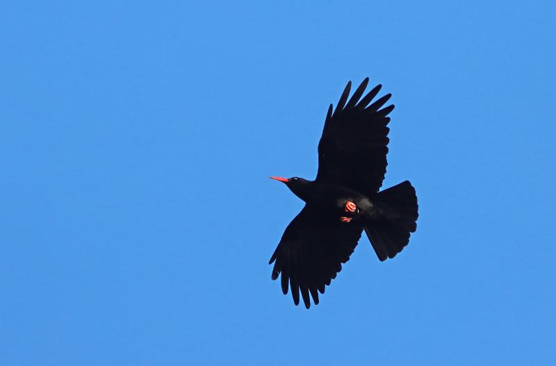 Alpekrager såvel som andre mørke kragefugle er altid en udfordring for fotografer - der skal overeksponeres og derfor kan omgivelserne ofte bliver overbelyste... og kun sjældent bliver man helt tilfreds - til gengæld er de en sjov fugl, og ganske nydelig med det røde næb og bentøj.