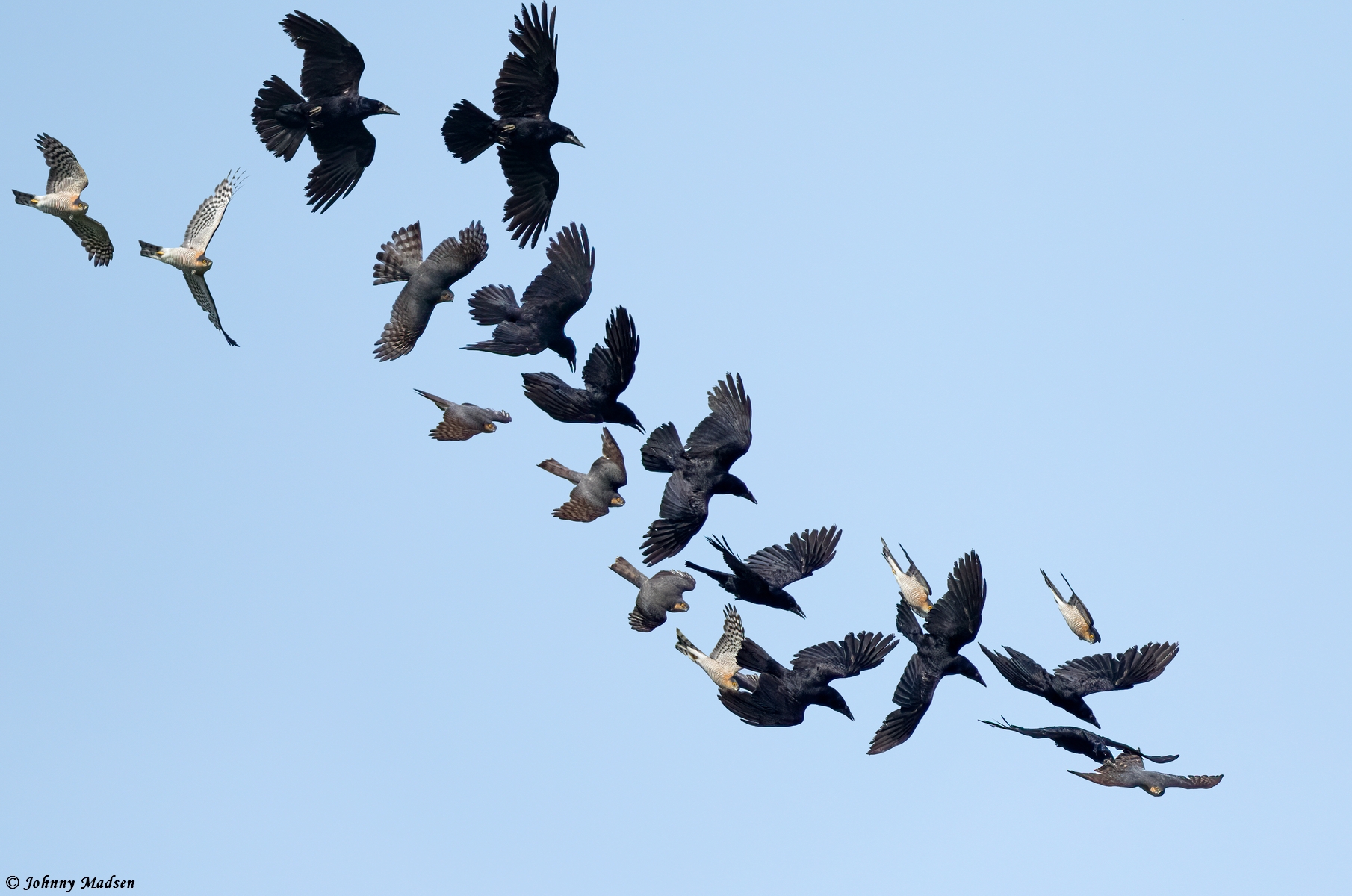Collage af Råge der mopper Spurvehøg. Billedet gør sig bedst, hvis der klikkes på det et par gange.