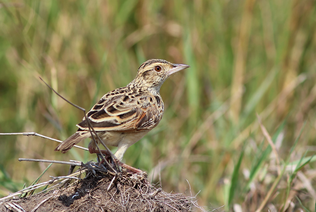 Det er en Rufous-naped Lark, som Rune også er inde på. Bemærk det store røde felt i vingen, som er synligt på billedet. Rufous-naped Lark kan forveksles med Red-winged Lark, der ligeledes har et stort rødt vingefelt, men er meget større og desuden geografisk adskilt fra Rufous-naped. Flappet Lark er mindre og med kortere næb,