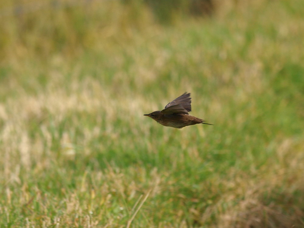 Nej, men faktisk rammer du temmelig meget plet når det kommer til oplevelsen af denne fugl. Den er jo ikke meget større end en gærdesmutte, og sås som regel kun lige smutte om et hjørne eller løbende rundt efter føde a la gærdesmutte. Og dens teck-teck-teck kald mindede også om gærdesmutte og den rustrøde farve ligeså. Faktisk kunne Jan og jeg ind imellem blive i tvivl om det var denne fugl eller en grædesmutte, der lige kom frem et splitsekund i græsset. Men ok, når den sås mere end et splitsekund var den nu temmelig anderledes alligevel - og så manglede den 2 halefjer i den ene side. Et godt feltkendetegn.