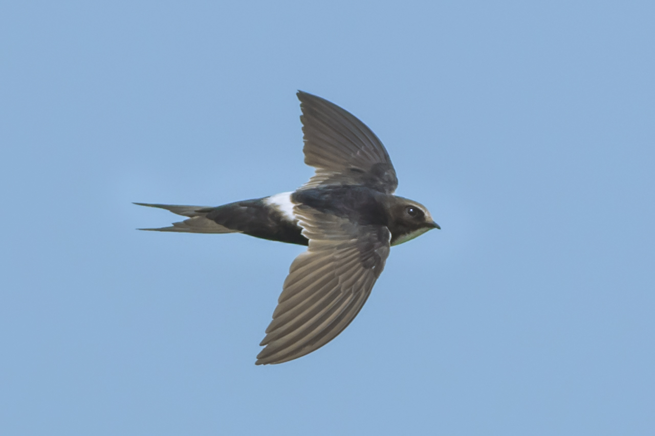 Tættere på (akkurat synlig på billedet) ses markant afsat hvid strube og de hvide spidser inderst på armsvingfjerene danner en mere eller mindre tydelig, kort hvid bagkant. Nogle gange ses den på afstand andre gange er det nærmest umuligt at få øje på!