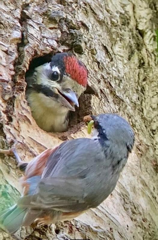 Beskrivelse: Spætmejse fodrer en næsten flyvefærdig flagspætteunge. “ Interspecific Feeding”