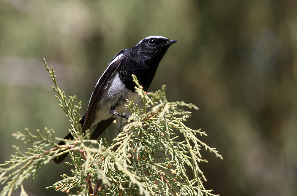 Beskrivelse: Arten er en af de smukkeste og især hannen med sort/hvid kontrasterende fjerdragt med en sart blå-grå isse og øvre nakke. I yngletiden foretrækker hannen, at synge fra toppen af et nåletræ, og kan derfor være vanskeligg at få set ordentlig. Men i træktiderne som marts og april, kan man være heldig at opleve hvorledes territoriehævdende hanner jager eventuelle konkurrenter væk - og derfor ses fuglene både på jorden, i buske og i træer. Ofte er fuglene mindre sky og pludselig kan man opleve at stå ansigt til ansigt med denne fine fugl. Hunnen ligner de øvrige rødstjerte-hunner; en leverpostejsfarvet fjerdragt med mørkerød overgump og hale, en bleg øjering samt svage lyse bræmmer på svingfjer og tetialer. Sangen er forunderlig. En typisk skælvende rødstjerte-sang, men pudsigt nok, lyder det som om hannen synger fra et stort hult plasticrør, og fuglene kan være være at stedfæste. P samme fænomen som opleves hos de nordamerikanske drosler. Arten overvintrer i det sydlige Himalaya, dvs umiddelbart syd for arten yngleområde - en kortdistance trækfugl. Men jeg kunne godt mistænke arten for at overvintre (omend fåtalligt) i yngleområdet, da jeg eksempelvis sent om efteråret har set hanner i snedækkede yngleområder i Kirgisien. Det samme er tilfldet med eksempelvis Humes Sanger - den lille djævel må være hårdfør, idet den allerede er tilstede i marts, og også ses i dens snedækkede yngleområder i Kirgisien. Sidstnævnte er interessant, og kunne snildt antyde at eksempelvis de sibiriske skovsangere relativt problemløst kan overvintre i eksempelvis Skaninavien, præcis som det har været tilfældet denne vinter med de sydsvenske sibes.