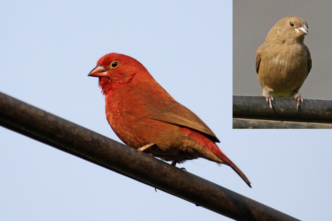 Det rødlige på næbbet, det røde hoved og de brunlige (ikke sorte) underhaledækfjer er karakterer for arten Red-billed Firefinch (L.senegala). Det lille billede af en hun/ungfugl er sandsynligvis samme art - det røde felt mellem øje og næb er dog kun svagt markeret.