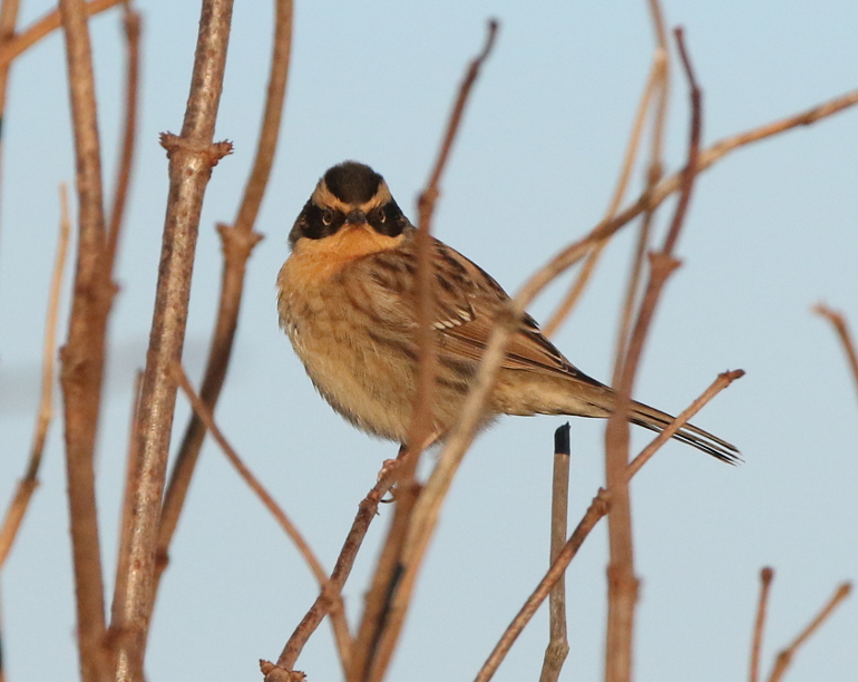 Beskrivelse: Jeg kom derop kort efter solopgang og var heldig, at denne smukke fugl i en kortere periode var fint fremme. Den sad både lavt og højt i buskene og sad indimellem og kaldte lidt, inden den gik ned på jorden for at finde føde.