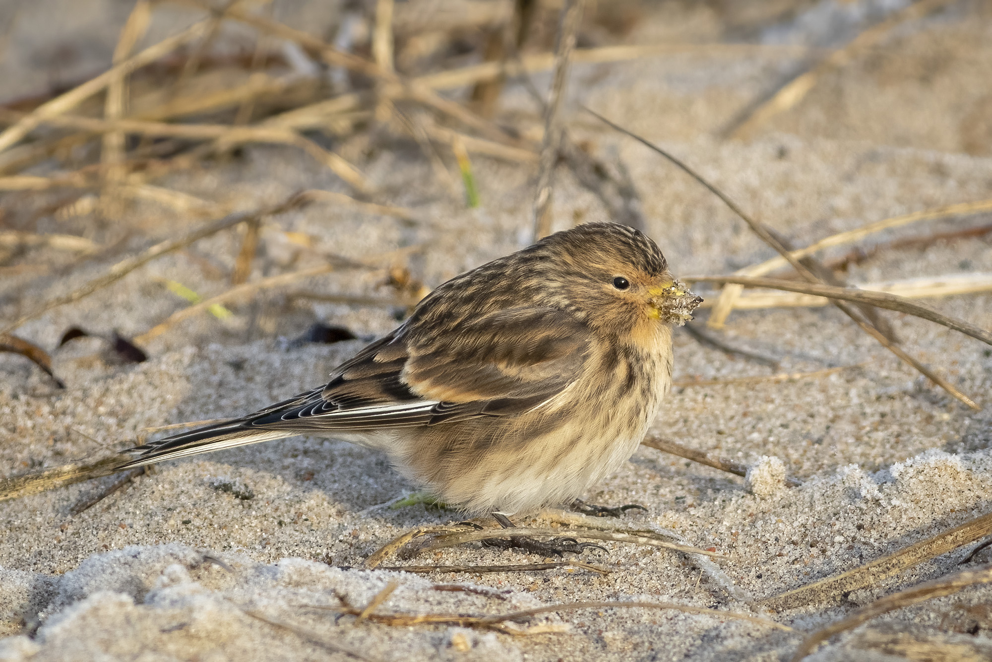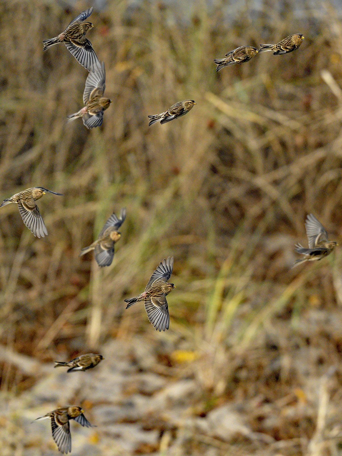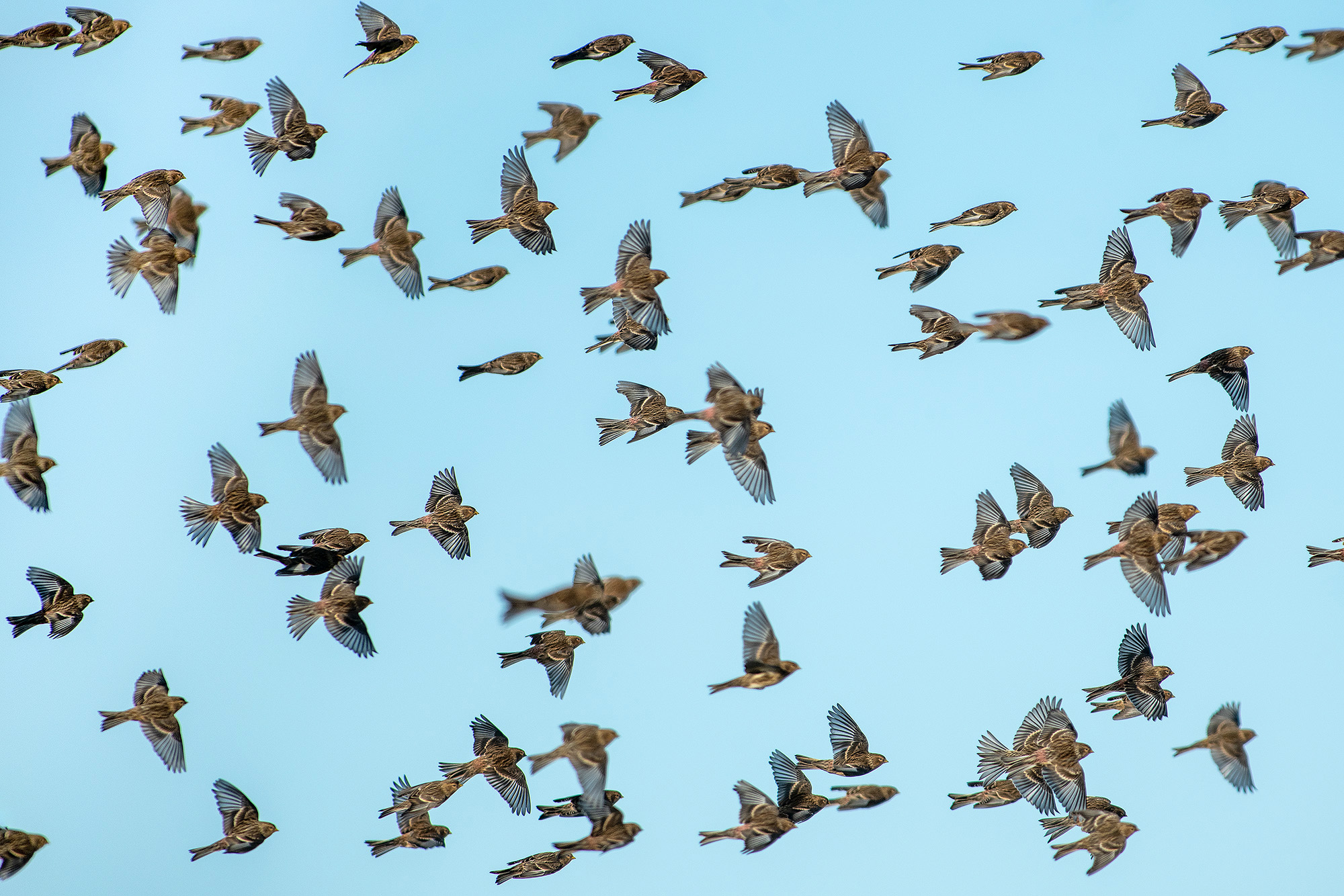 Beskrivelse: Bjergirisk del af flok på mindst 100 fugle