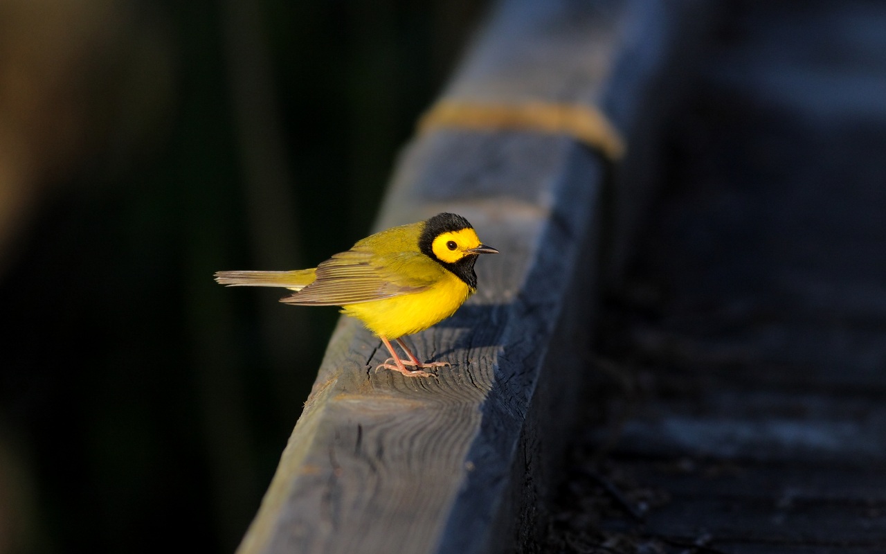 Beskrivelse: Hooded Warbler fouragerer tæt på jorden, og kan på trods af sine klare gule farver være svær at se, når den hopper rundt mellem planterne.