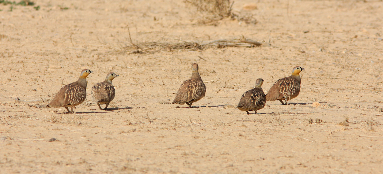 Beskrivelse: A mixed flock of Crowned and Spotted Sandgrouses.