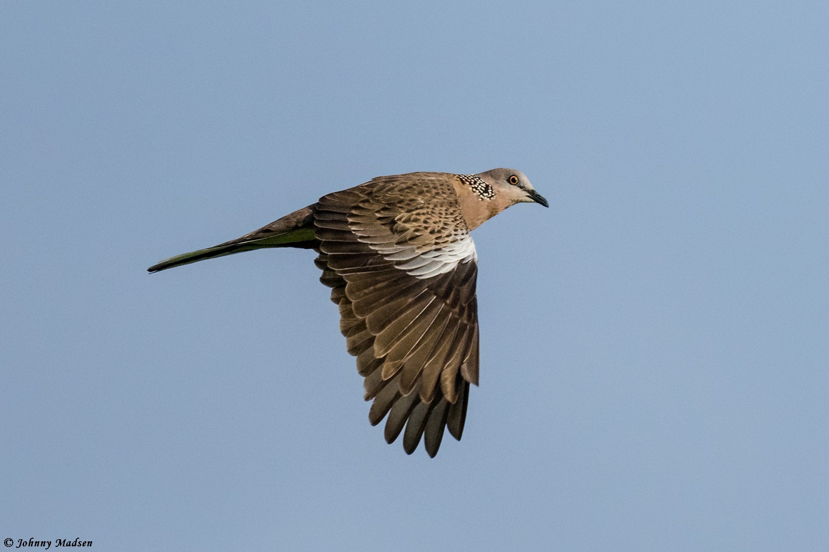 Beskrivelse: This dove is not native to Australia, but very common in SE and around Perth. It is ssp. tigrina due to distinctive black shafts of feathers on upperparts (and withe vent/under-tail)