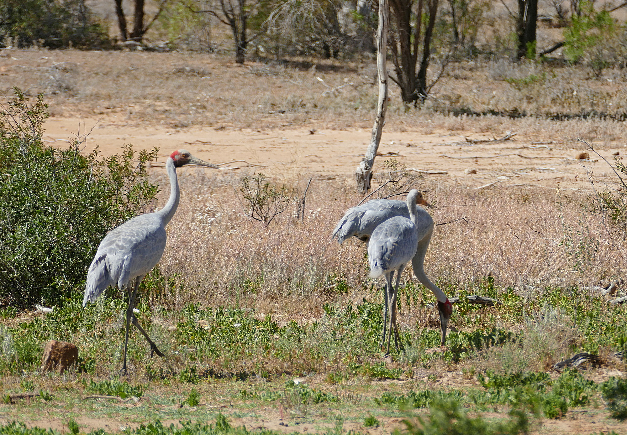 Beskrivelse: Vandfugle i Australien må kunne tilpasse sig omstændighederne, som dette par traner, som nok havde haft et vådområde, da rugningen startede, men nu kun havde en fugtig, mudret plet tilbage, efter lang tørke.