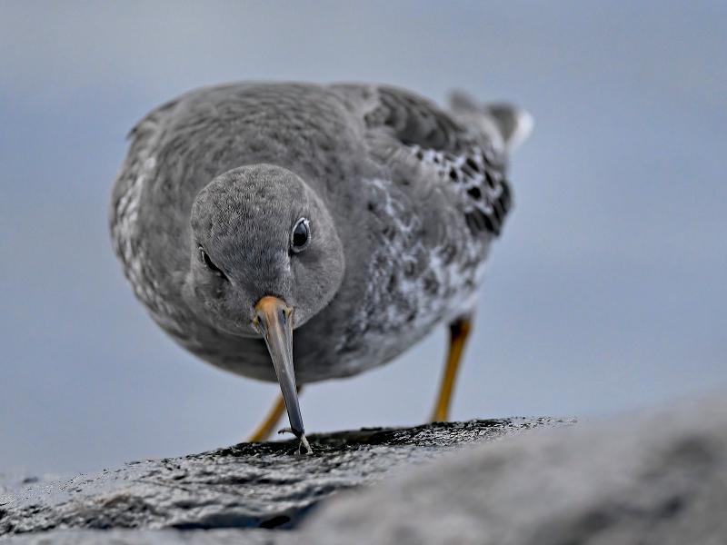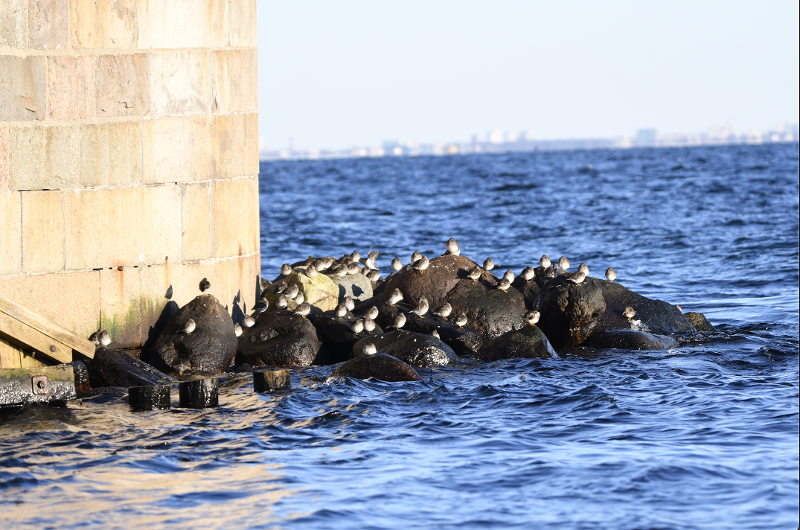 Beskrivelse: Så 15 sortgrå ryler på molen i Hvidesande. Væksterne på stenene siede smådyr fra bølgerne.