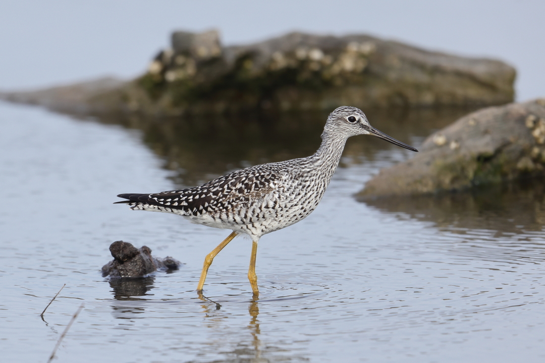 Beskrivelse: Det er på denne afstand, Sveriges Stor Gulben ses på efter nytår, hvor den har slået sig ned i et fortsat lavvandet område (fortsat p.g.a. formodet tilfrysning), hvor den løst flger en flok storspover. Den fouragerede en del, men var ved passage af såvel Vandrefalk som Havørn den eneste fugl i området, der ikke lettede, hvilket kunne vække bekymring. Fuglen ligner på afstand en typisk større klire - ikke så hvidklireagtig som jeg mindes fra Amerika. Den virker større end Rødben, mere kompakt med mørktegnet hoved, bryst og overside imod hvid bug.Hovedet virker relativt lille, skønnet mindre end Hvidklirens og næbbet lidt kortere og mere lige. De gule ben ses ikke her, men afslører effektivt fuglen - og den kan jo teoretisk fortsætte sydpå til Danmark.