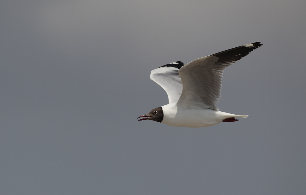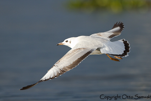 Beskrivelse: Brunhovedet Måge i 1. vinterdragt. Arten fælder - i hvertfald i dele af udbredelsesområdet - mere avanceret til 1. vinter end andre mågearter, og kan således allerede efterår/vinter fælde de juvenile dækfjer til adulte af grå type. Desuden fælder mange halen - enten dele af den eller hele halen, og de bliver da hvidhalede som man ser på denne fugl.