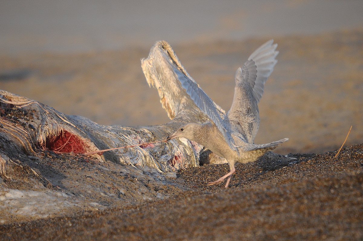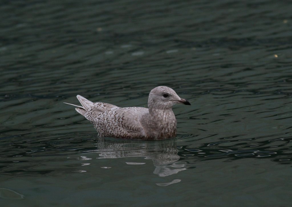 Beskrivelse: Hvidvinget Måge i 3. vinterdragt. Læg mærke til den fine grå, men ret skarpt afsatte tegning på yderfanen af yderste håndsvingfjer. Havde fuglen været fuldt adult havde dette været kendetegn for "kumlieni", som kan regnes som en overgangsform/hybridsværm mellem Thayers Måge (vist kaldet Iniutmåge af DOF). Tilsyneladende kan udflydende mørke tegninger i håndsvingfjerene ses hos en del immature Hvidvinget, men det er dog ikke endeligt afklaret om, hvorvidt disse fugle med mørke tegninger i hånden stammer fra Grønland(hvor Hvidvinget Måge, glaucoides yngler) eller hos fugle, hvis oprindelsesområde ligger længere vestpå, i arktisk Canada. Eftersom ren Hvidvinget som adult og juvenil bør mangle mørke vel afgrænsede tegninger i vingespidsen, kan denne fugl godt nævnes som mulig "kunmlieni" - den mørke tegning i yderste håndsvingfjer er definerende for "kulieni" i adult dragt.
