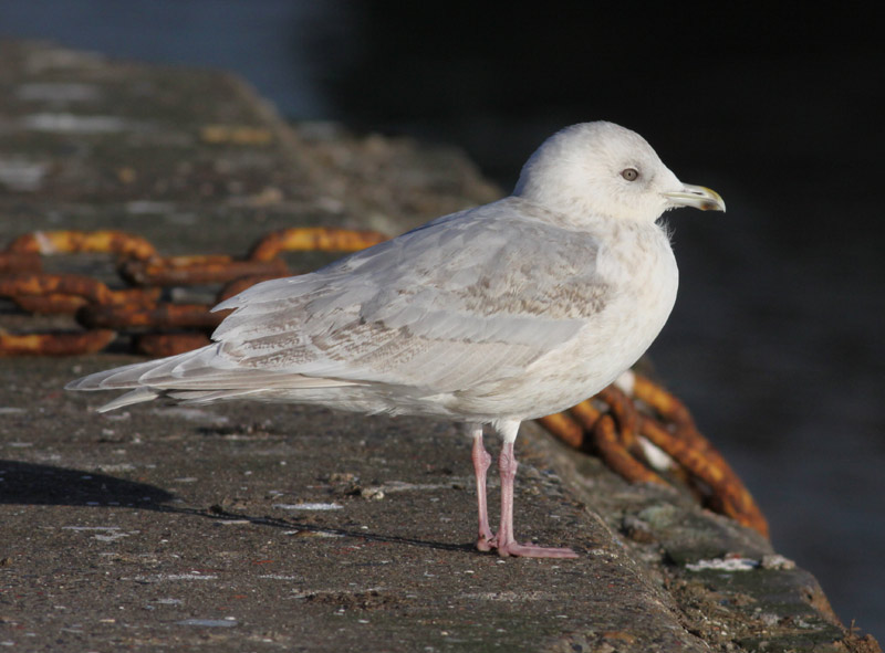 Dette er den meget lyse fugl, der blev opdaget 25.2 om formoddagen ved jollehavnen/Tværmolen - de "små hvide´s" favorittilholdssted i Hirtshals Havn. Dette er en meget lys fugl, og hvis man regner kumliens som egen form vil man nok kategorisere denne som kumliens x glaucoides. Hvis man regner kumlieni som en meget variabel (hybrid)form, der inkluderer alt mellem Hvidvinget Måge (glaucoides) og Thayers Måge, kan denne regnes som kumlieni på grund af den svage mørke tegning i vingespidsen, incl. mørke pletter i spidsen af de tyderste håndsvingfjer.