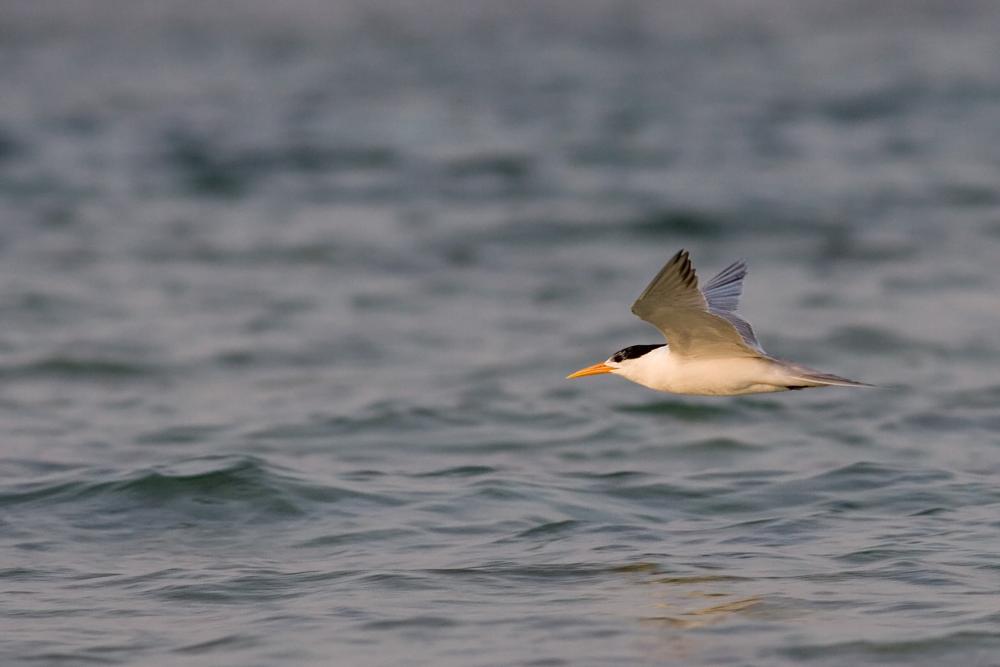Den flyvende fugl til venstre har dog et lidt mere gift-grønt næb end de andre. Men den har lys ryg og samme størrelse som de andre Bengalske terner på billedet. Jeg vil mener, at alle fuglene på billedet er Bengalske Terner.