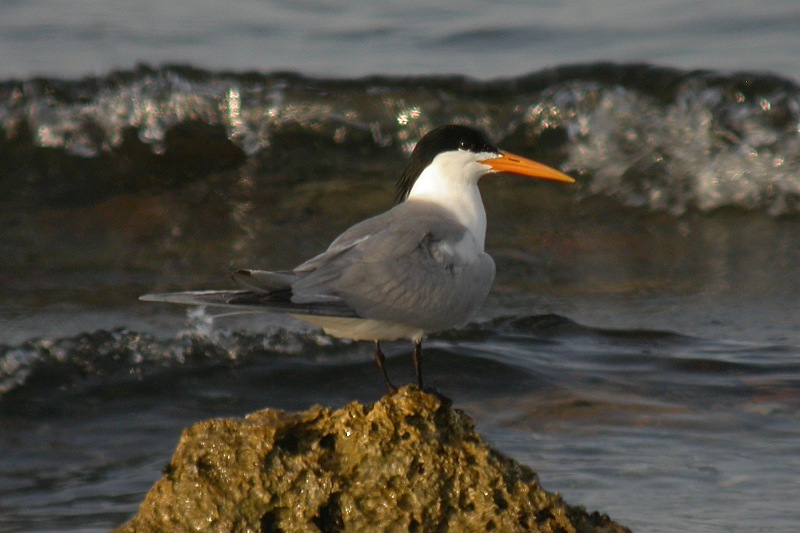 Medmindre lyset virkelig spiller mig et puds på dette foto, vil jeg hævde at rygfarven er for lys til Bergiusterne og, at fuglen snarere er en Bengalsk Terne. Næbbets form og kraftige varme farve synes også at indikere dette.