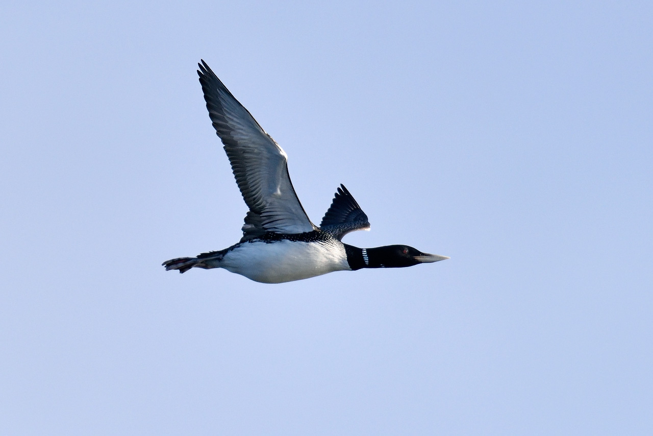De store lommer trækker gerne i lidt større højde, og tit lidt tættere på land - end flokkene af de talrige Rødstrubede Lommer. Nårmalt opdages de ved at en opmærksom observatør - i dette tilfælde Jørgen Hulbæk - råber: STORLOM. Og da Islom har sort, og Hvidnæbbet Lom lyst næb, burde artsbestemmelsen hurtigt sikres. Det er dog ikke altid tilfældet: når fuglene opdages en tid før de passerer obs.posten falder lyset lidt skævt ind, så næbbet ikke bliver så tydeligt, som når fuglen passerer lige forbi eller lidt væk fra én, hvor den direkte medsol sikrer, at Hvidnæbbet Loms næb lyser op som en projektør i stor kontrast til det blæksorte hoved. Fuglen her er fotograferet en tid før passagen, og næbbet har en tendens til at blive udvisket og forsvinde mod himlen - en effekt der er særligt tydelig mod lys grå himmel. Her kan Hvidnæbbet Lom virke næbløs.