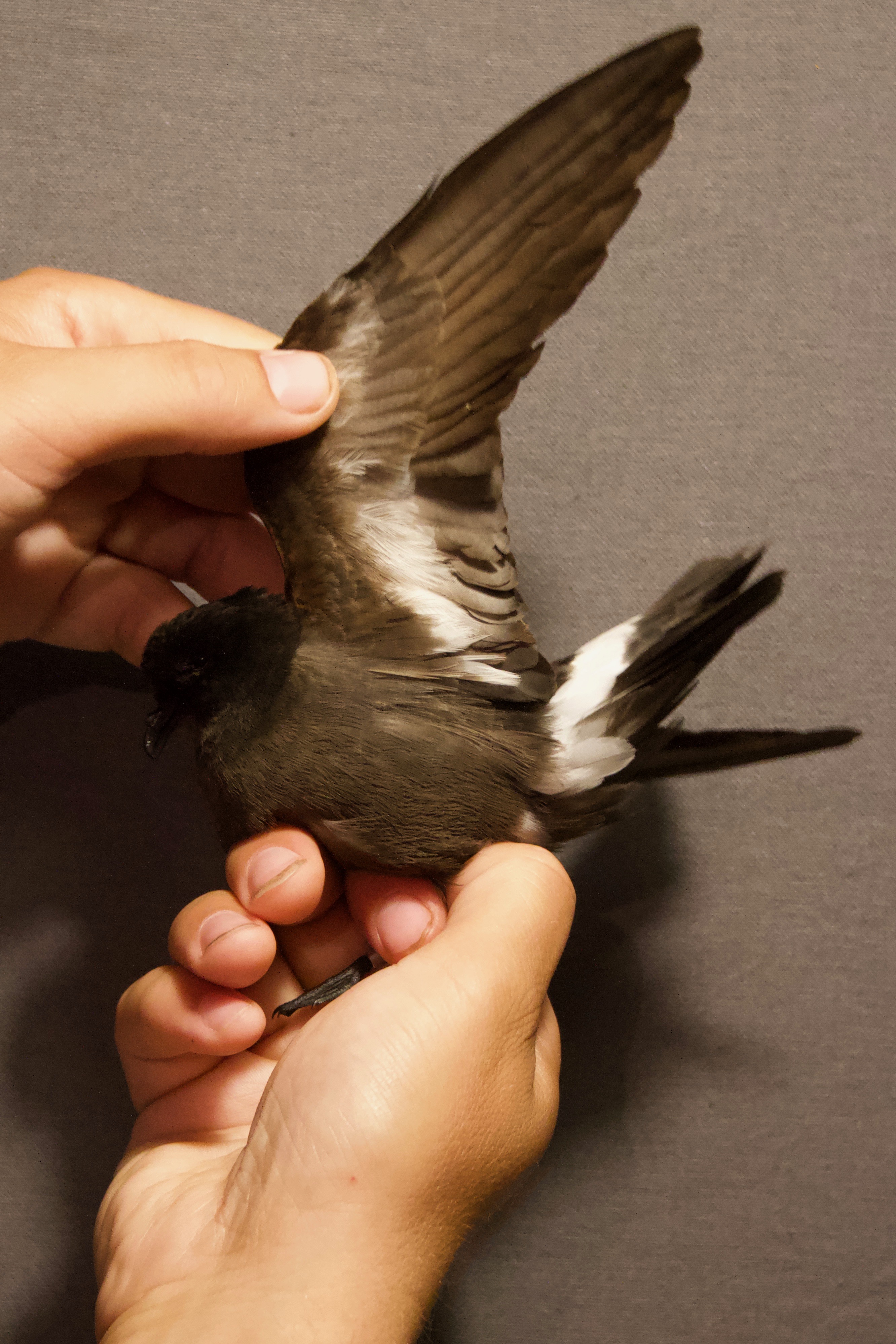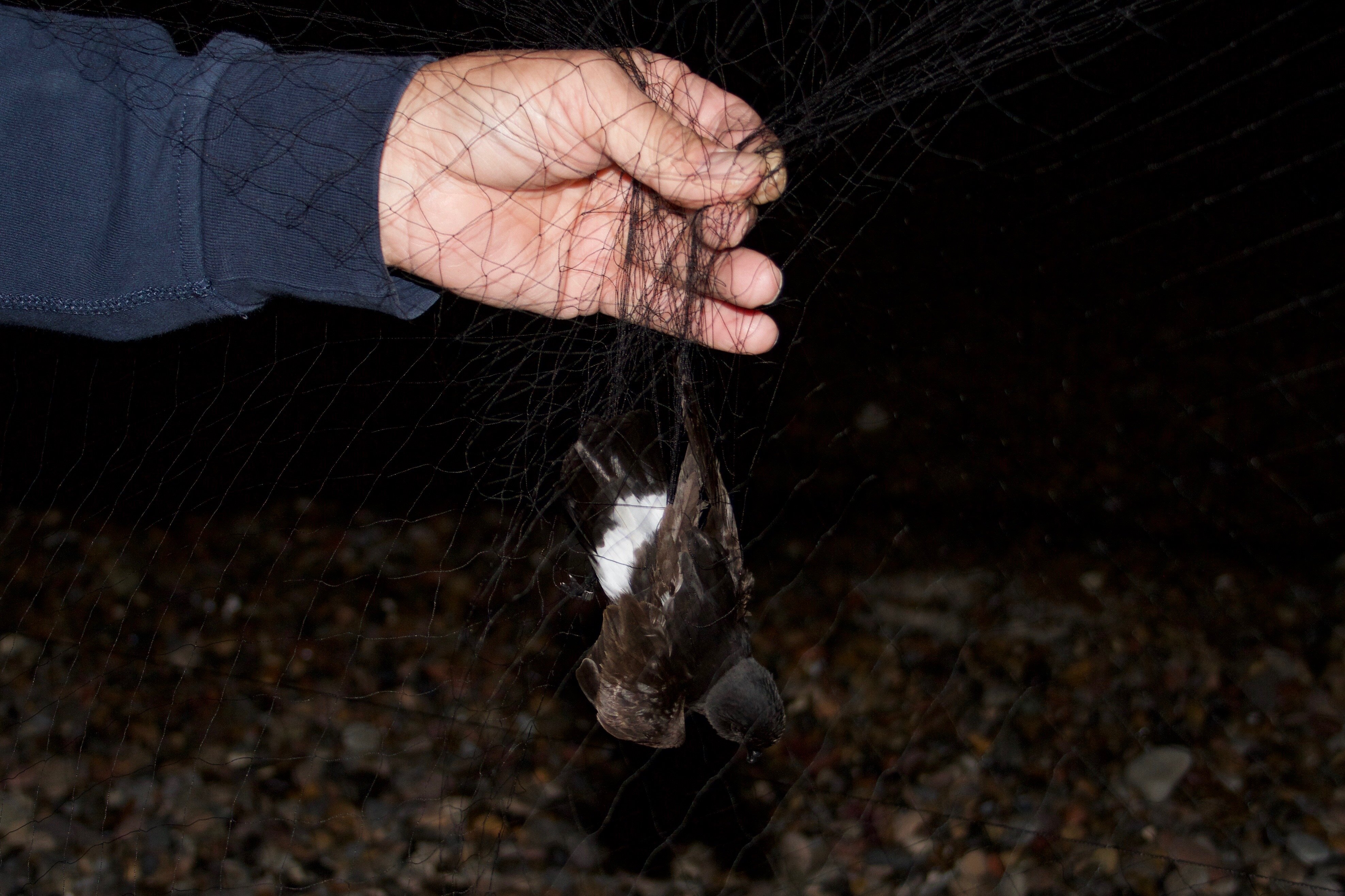 Beskrivelse: Skagen Fuglestation har knækket koden til hvordan man fanger lille stormsvale i Danmark. Denne fugl er den tredje fanget indenfor en uge. Foto taget uden blitz aht. fuglen.