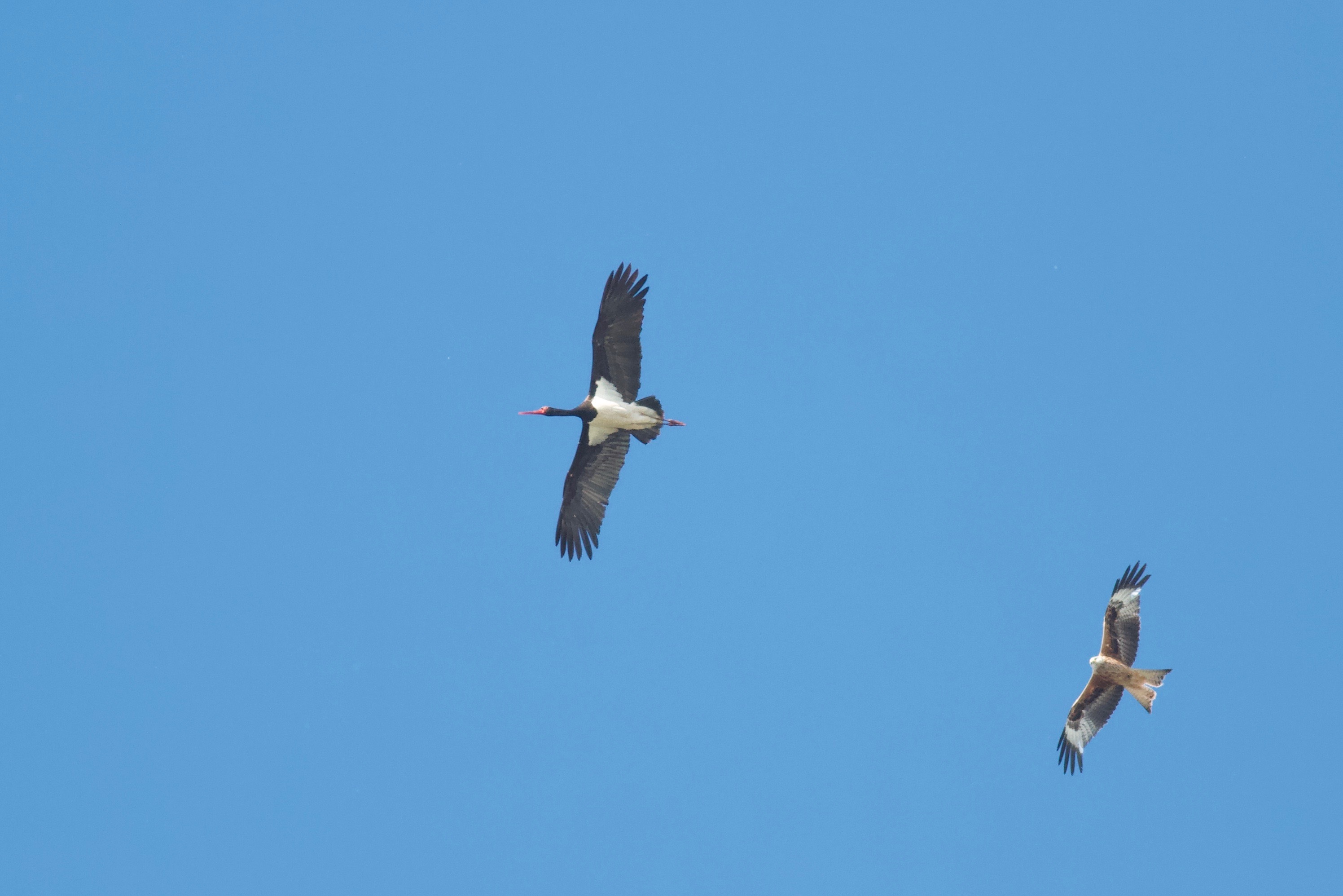 Beskrivelse: Ung Sort Stork i flok med 17 Hvide Stoeke, sidstnævnte fra det svenske storkeprojekt. Flokken trak ud fra Falsterbo 24.8, og holder de næste dage til på en mark i området ved Ollerup/Næsbyskov, hvor flokken skifter mark efter hvor det høstes. De følger ivrigt pløjningen, der kværner smådyr, der derefter fortæres af storkene. Fuglen er formentligt den samme, der i dagene omkring 20.8 holdt til på en mark ved tomelilla i Skåne, her i selskab med en enkelt Hvid Stork