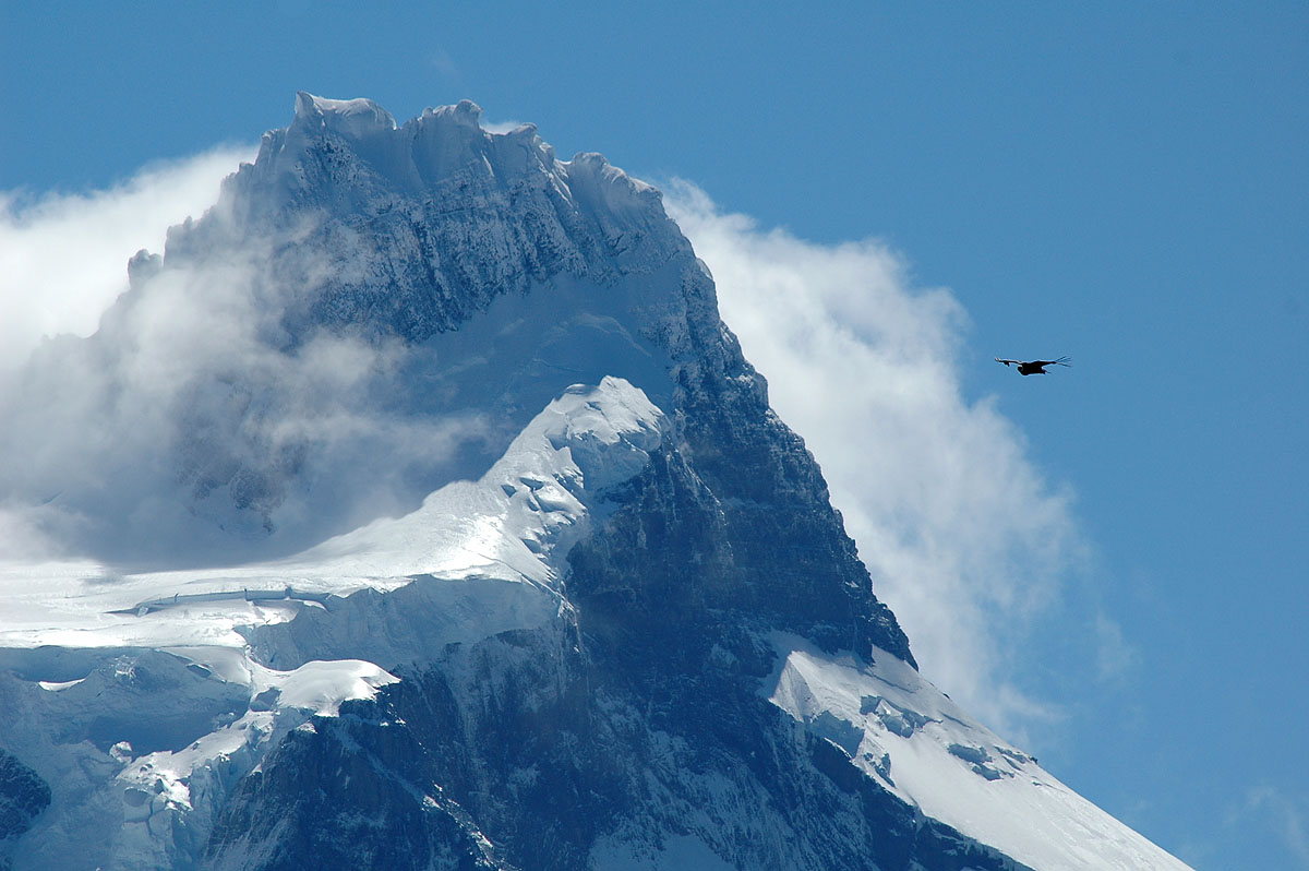 Beskrivelse: This is an enlargment of a picture already uploaded. It clearly shows the Black-chested Buzzard-Eagle, but it also reveals a new bird - swift-like - appearing rather big. The back ground Mountain is Fitz Roy (3500m) but the pic is taken from much lower altitude. I would say that the birds are below 2000m.