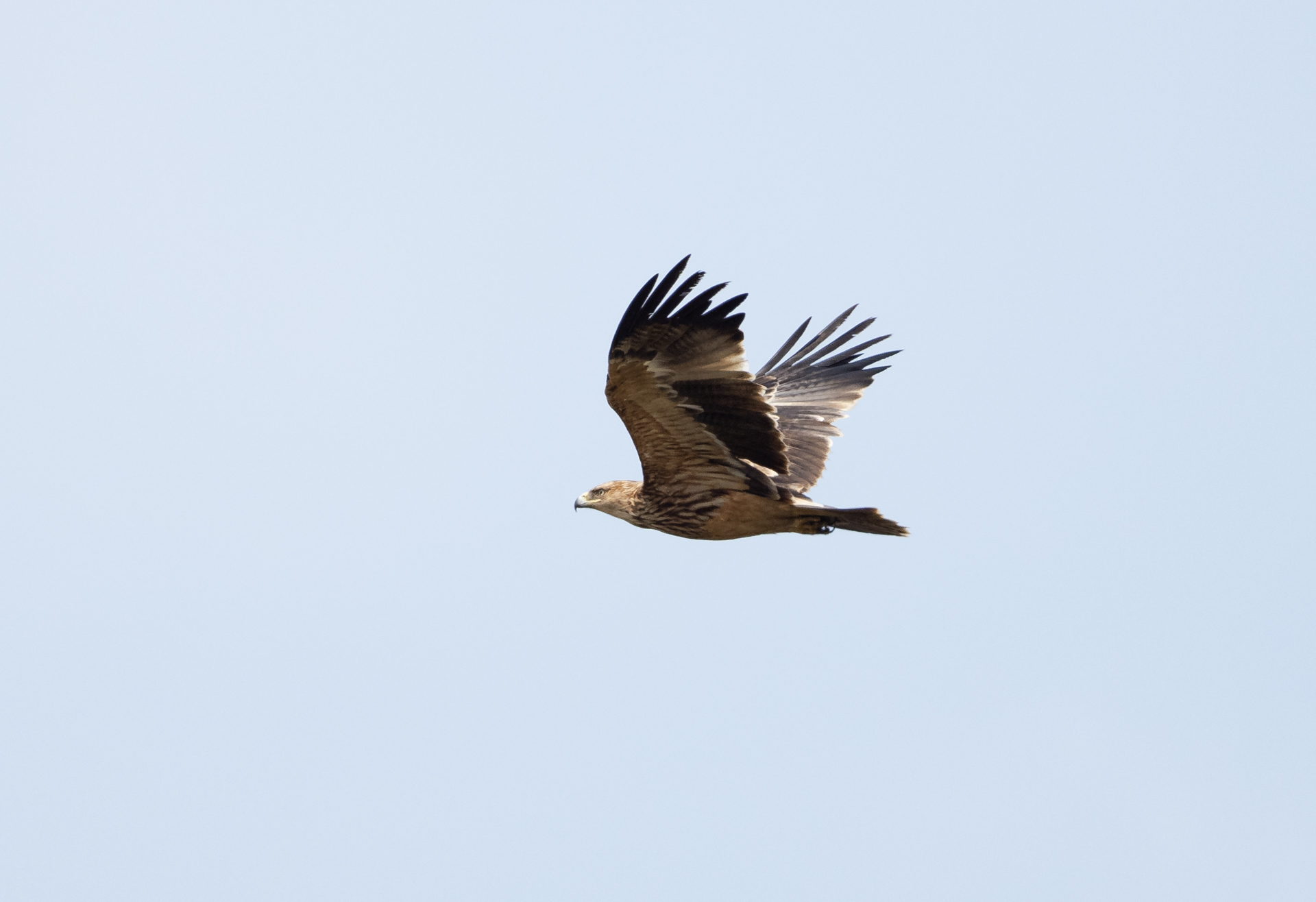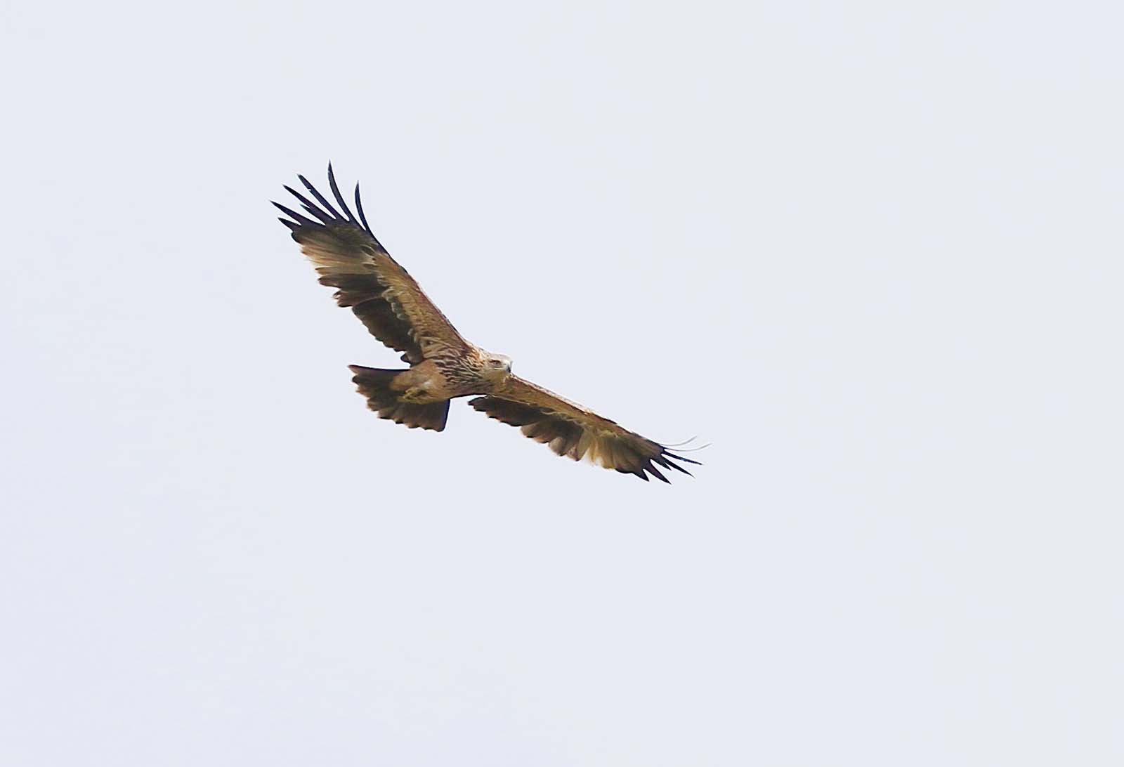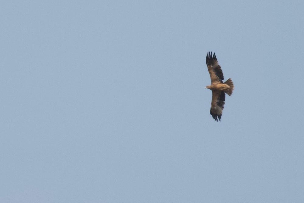 Beskrivelse: Kejserørnen kredser sammen med 2k Steppeørn over heden nord for Råbjergvej. Et historisk foto taget på stor afstand i varmedisen og kraftigt beskåret.