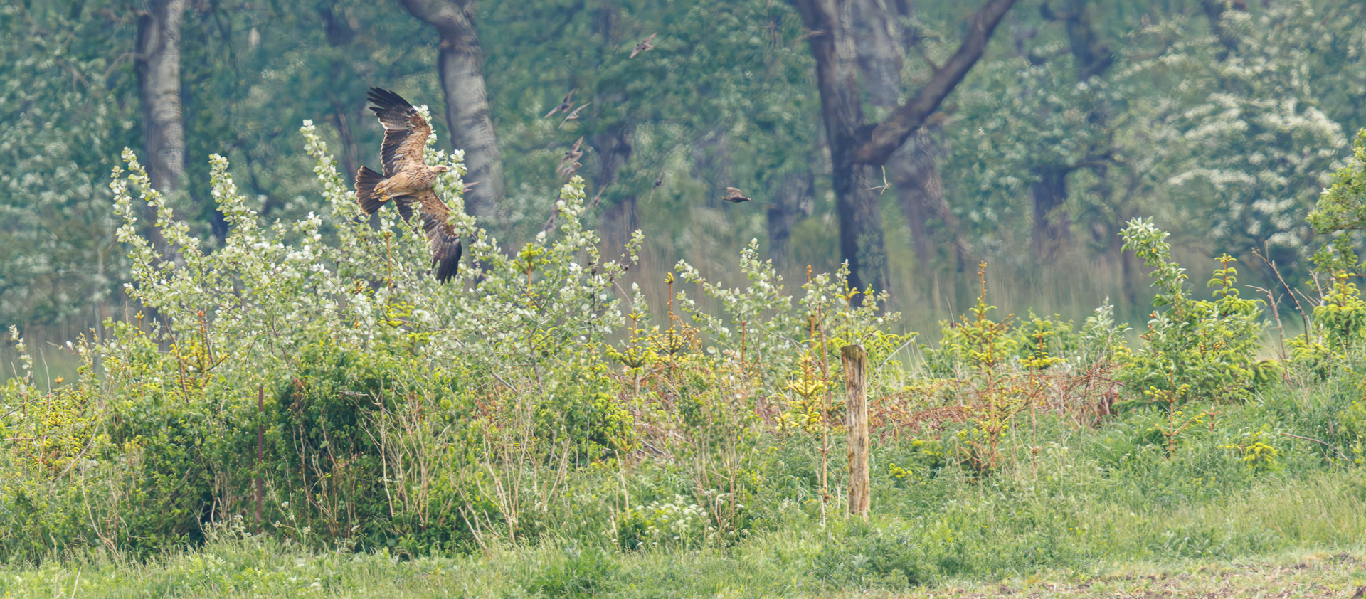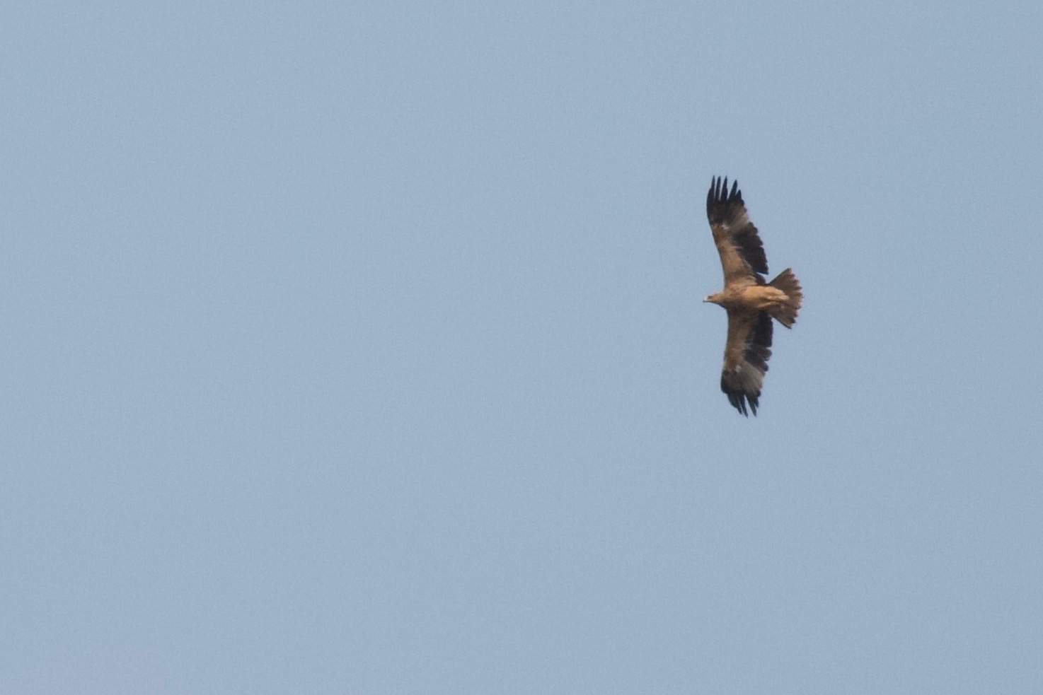 Beskrivelse: Kejserørnen kredser sammen med 2k Steppeørn over heden nord for Råbjergvej. Et historisk foto, taget på stor afstand i varmedisen og kraftigt beskåret.