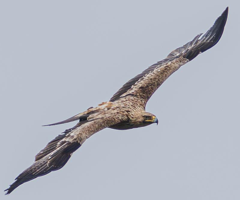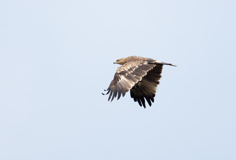 Beskrivelse: Immature Kejserørn over Østmøen. Efter fuglen havde overnattet midt på øen fløj den østpå, kredsede en tid over Mandemarke Bakker førend den fra 0958 indledte sit først langsomme, senere hurtigere træk mod nordvest for at forsvinde fra Nyord mod Jungshoved 11.15.