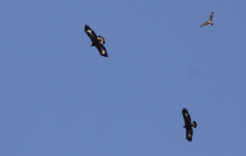 Beskrivelse: Denne smukke fugl landede på en mark, hvor den havde fået øje på landmandens kat. Katten forsøgte at gøre sig dobbelt så stor som normalt, men den kan vist takke fotografens tilstedeværelse for, at den kunne forsætte musejagten. Ørnen lod den leve denne gang.