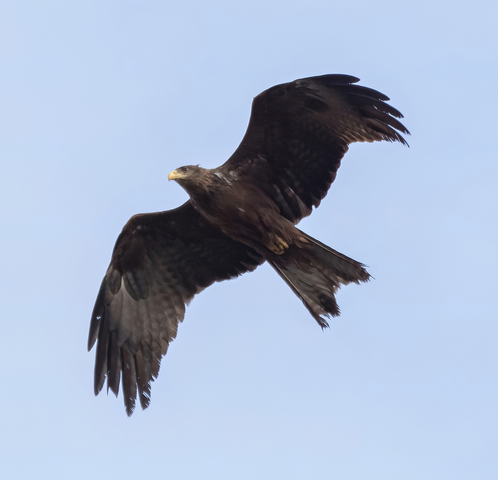 Beskrivelse: Adult Sort Glente (migrans) er nem at kende fra adult yellow-billed Kite, der som navnet antyder har helt gult næb.
