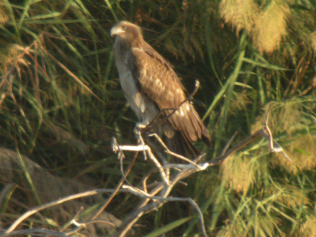 Beskrivelse: De fleste felthåndbøger til det indiske Subkontinent viser den unge Pallas Havørn som en ret lyst gråtonet fugl med tydelig mørk ansigtsmaske. De ungfugle, der blev set ved Kaziranga (hvor arten ikke er ualmindelig) viste en oventil betydeligt mørke fugl, der havde ret ensartet mørkt hoved og hals samt en overside, der mere lignede en yngre aquila uden lyse håndrodspletter. Undersiden er dog så typisk at den ikke er til at tage fejl af - se andet foto af samme fugl.