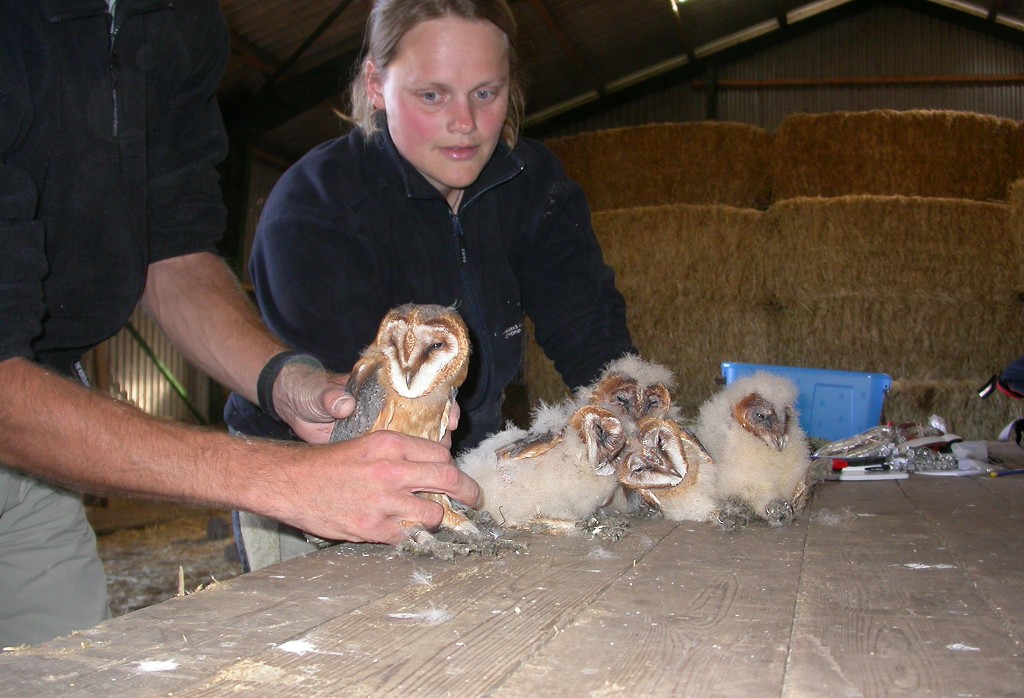 Til venstre ses Flemming, der er den stolte ejer af laden med slørugle-kassen, mens Elsemarie håndterer ungerne.