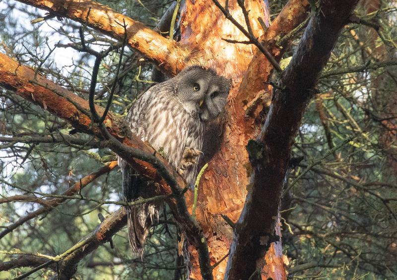 Beskrivelse: Uglen set i perioden fra Nytårsdag til foreløbig 10. januar 2023 rastende typisk højt i ældre fyrretræer