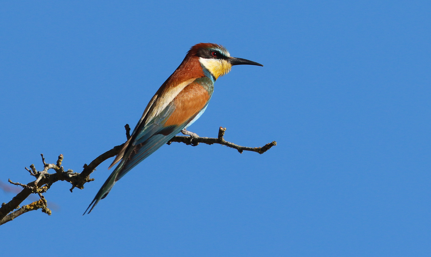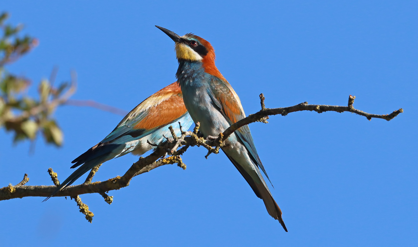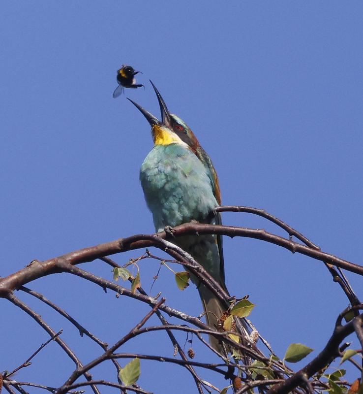 Beskrivelse: Fantastisk oplevelse. 12 biædere rastede i træer ved en mark, hvor de fouragerede før de gik til rast i en nabohave. På dette foto er der 11 biædere, som var det højeste antal, jeg fik på et foto