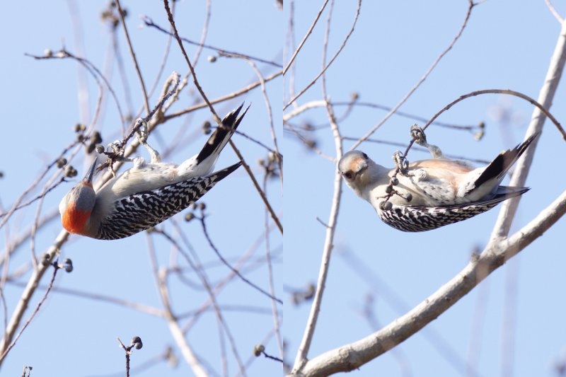 Spætter hængende som mejser i småkviste.