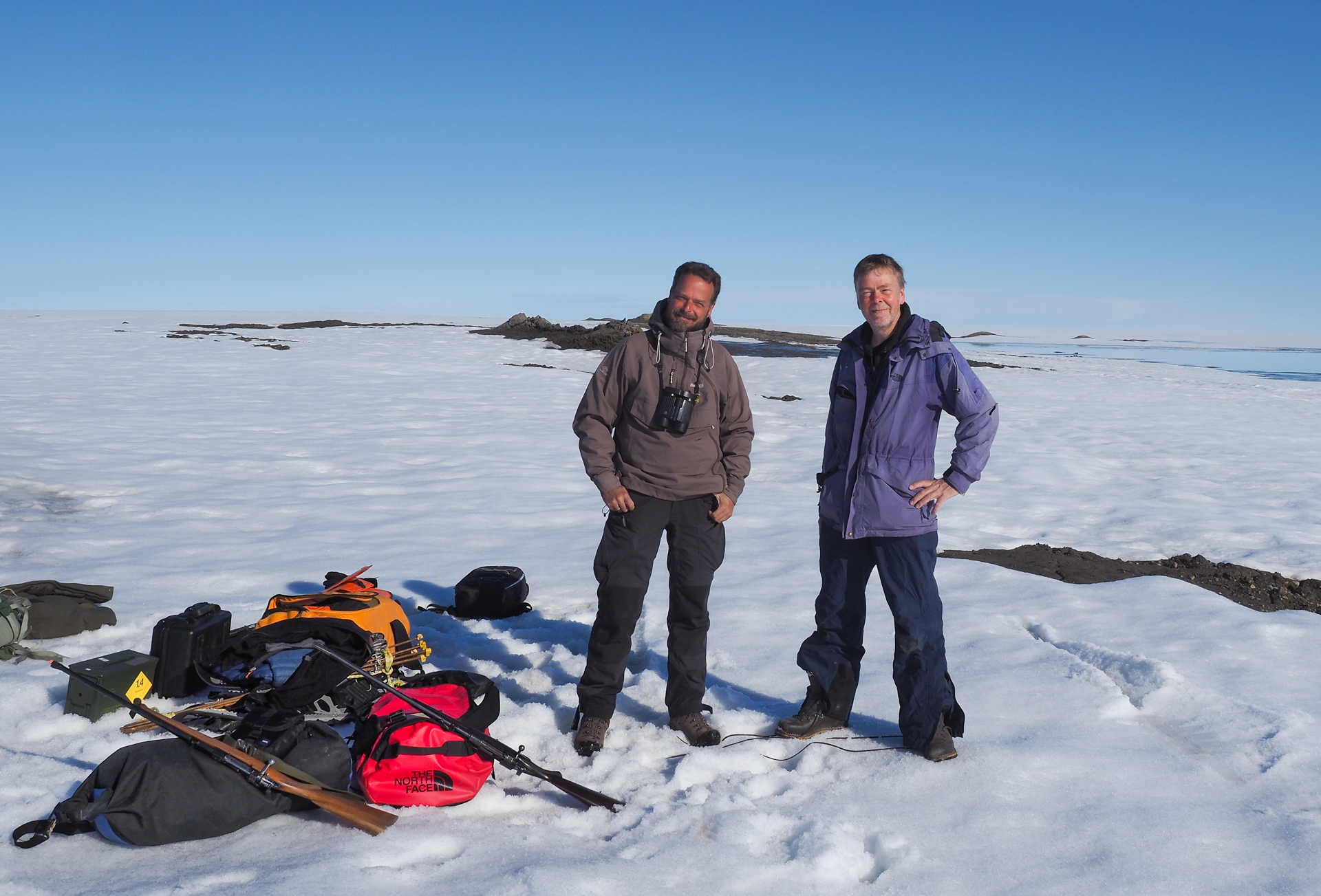 Beskrivelse: Morten Frederiksen (t.h.) og Henrik Haaning Nielsen er klar til feltarbejde i forbindelse med ismågestudier i Nordøstgrønland. Ismågekolonierne befandt sig på moræneknoldene i baggrunden. Foto er taget af Jonas Kofoed Rømer.