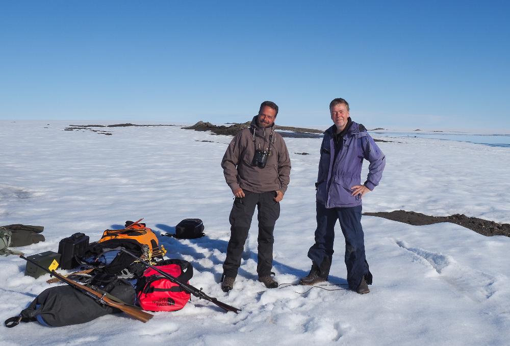 Beskrivelse: Morten Frederiksen (t.h.) og Henrik Haaning Nielsen er klar til feltarbejde i forbindelse med ismågestudier i Nordøstgrønland. Ismågekolonierne befandt sig på moræneknoldene i baggrunden. Foto er taget af Jonas Kofoed Rømer.