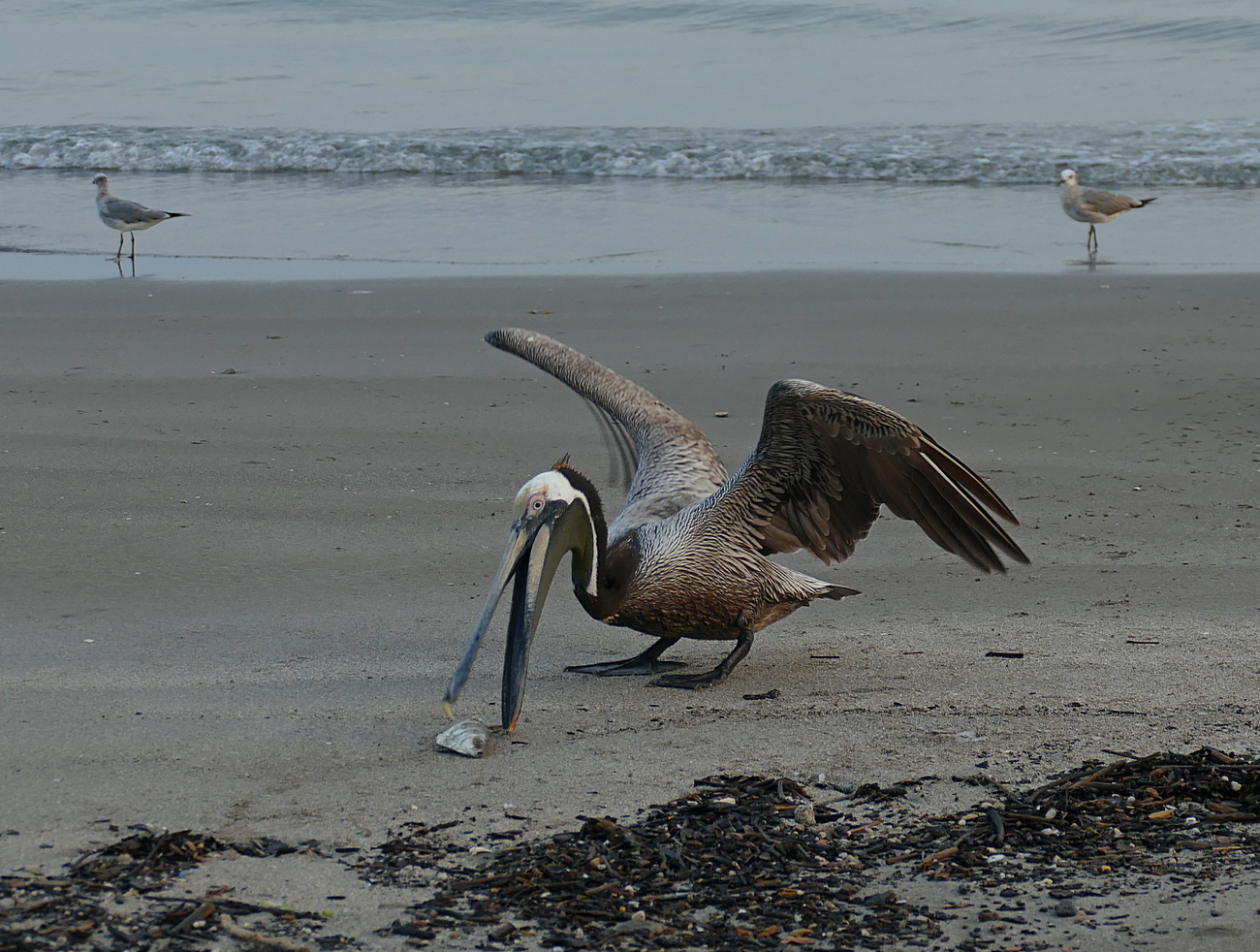Beskrivelse: Selv om Brown Pelican er kendt for at styrtdykke efter fisk, som en anden sule, er den dog også opportunistisk nok til at snuppe et nemt måltid på stranden.