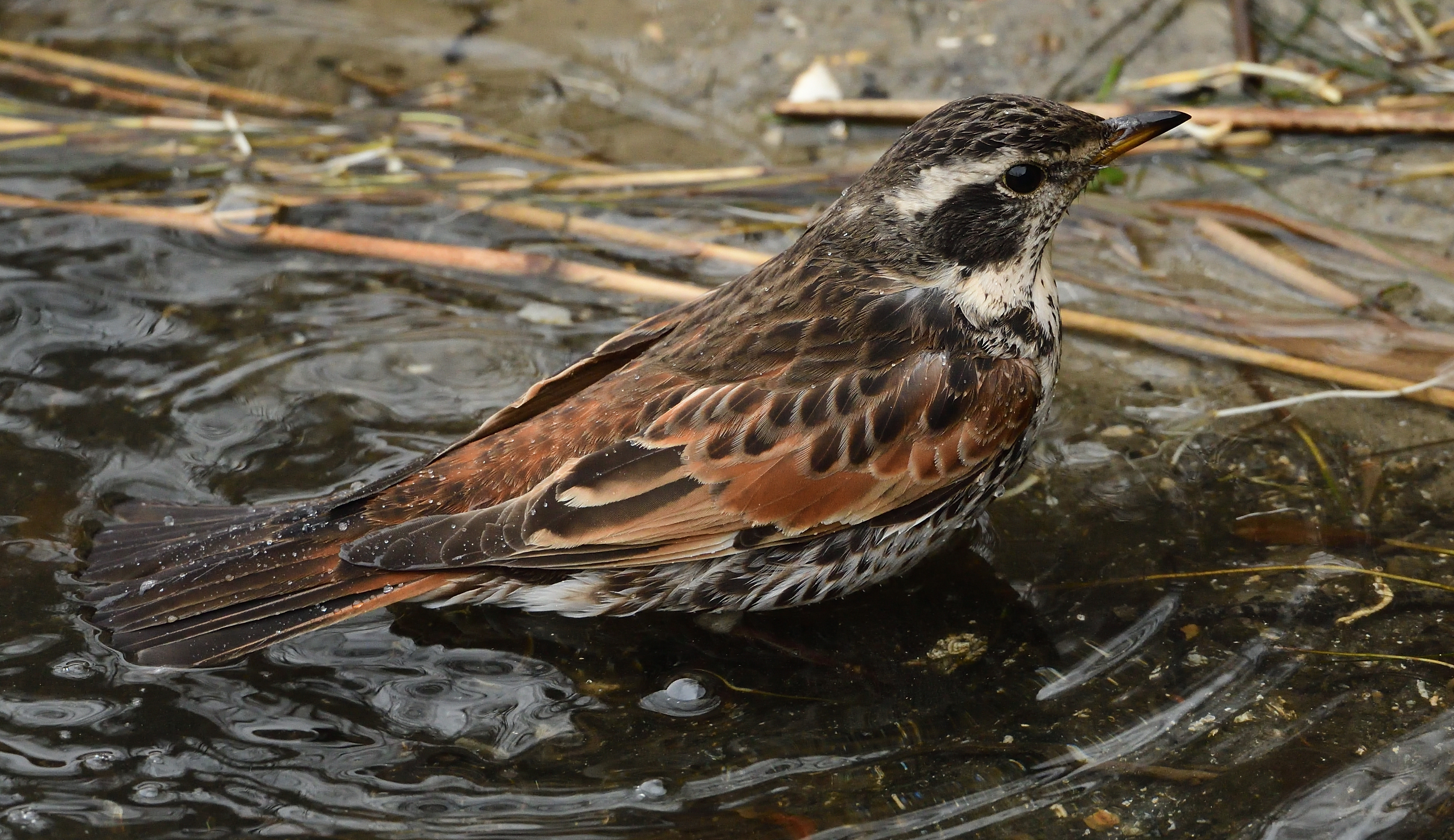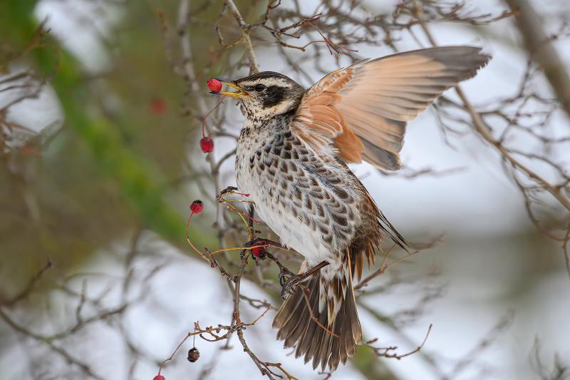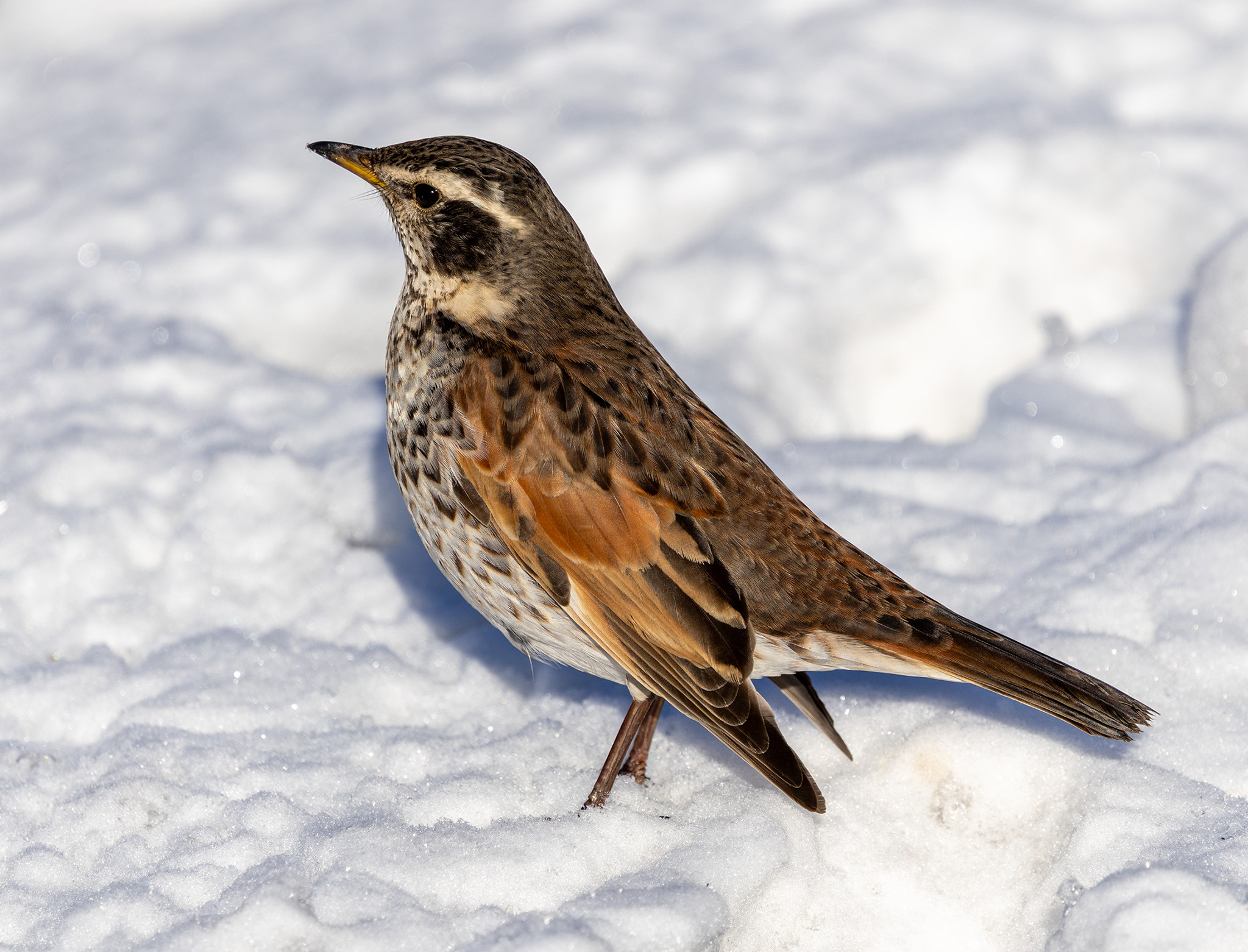 Beskrivelse: Her siddende på ræling langs med Krudtsløbsvej. Brundroslen er begyndt, at bevæge sig i mellem Nyholm og Krudtløbsvej i vinterkulden. Her følger den solsorte og søger efter områdets bærbuske.