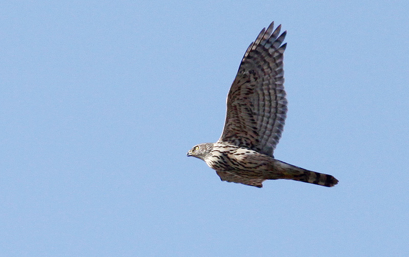 Duehøgens vingeform med lang arm med udbuget vingebagkant (ala Steppehøg) fremgår fint her, ligesom det lyse bånd gennem armens midte, der er i let kontrast til mørktegnede forreste dækfjer. En tegning, der ikkke ses hos Spurvehøg.