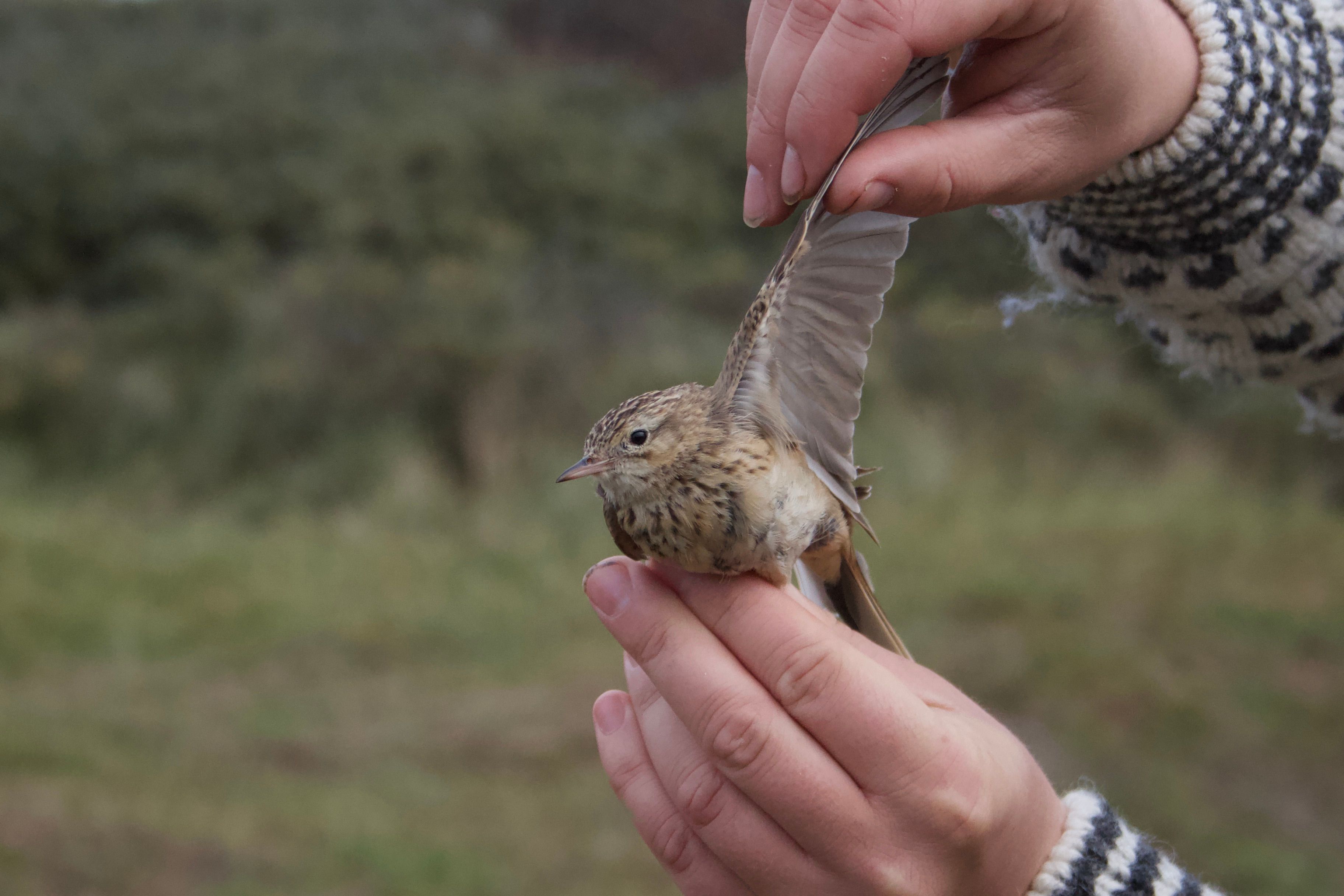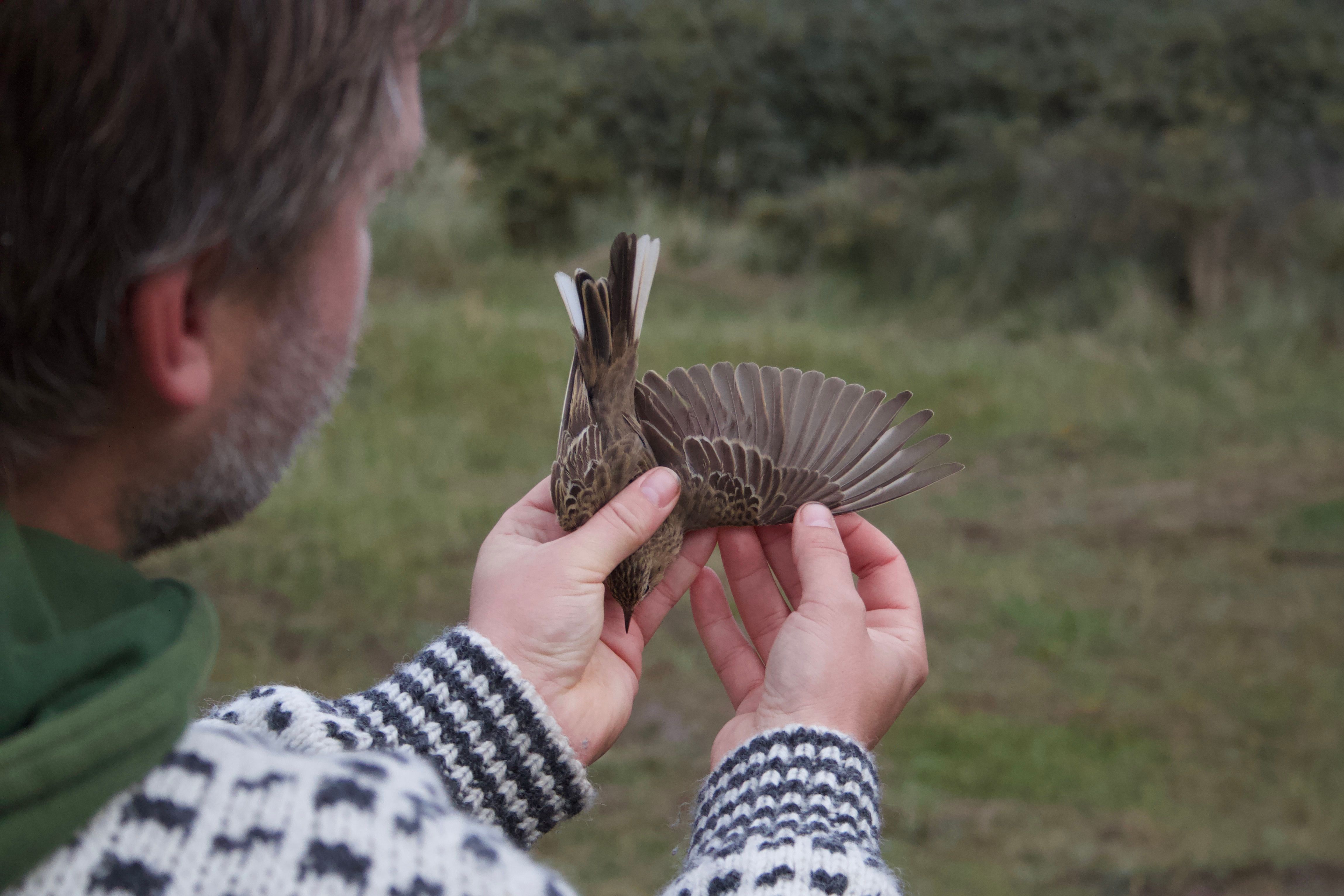 Beskrivelse: Fotograferet efter ringmærkning foretaget af Skagen Fuglestation