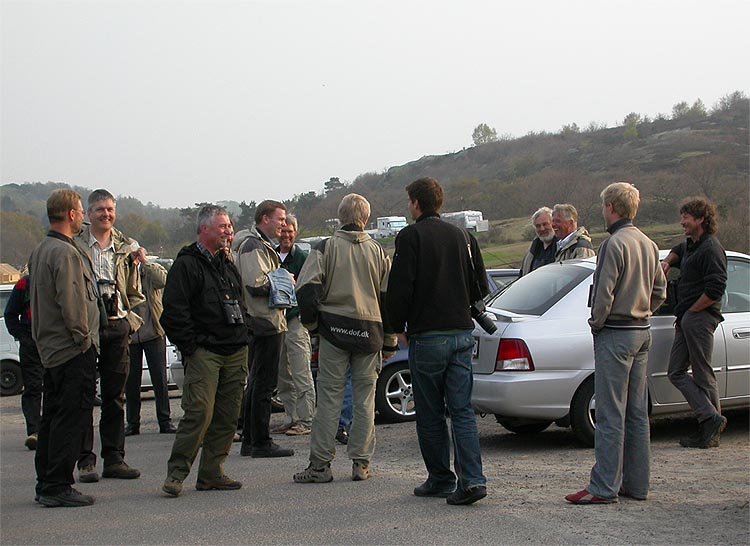 Billedet viser et udsnit af de mange højstemte rep.mødedeltagere, under hærfugloplevelsens postludium på Hammerknuden lørdag den 13. maj. Michael Grells udmelding om fundet var perfekt timet, da den indløb kl. 18.16 kort tid efter mødeafslutningen. Formand Hjorth med ryggen til ses omgivet af glade doffere fra hele landet.