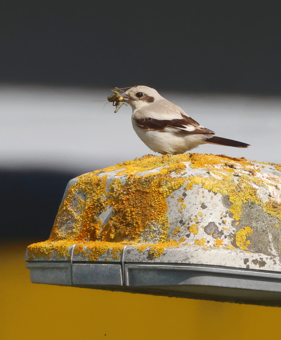 Titel: Stor tornskade, pallidirostris, med græshoppe