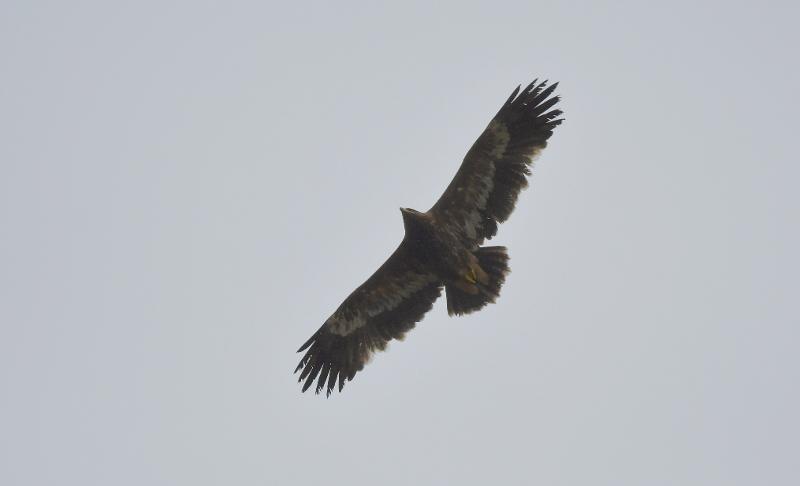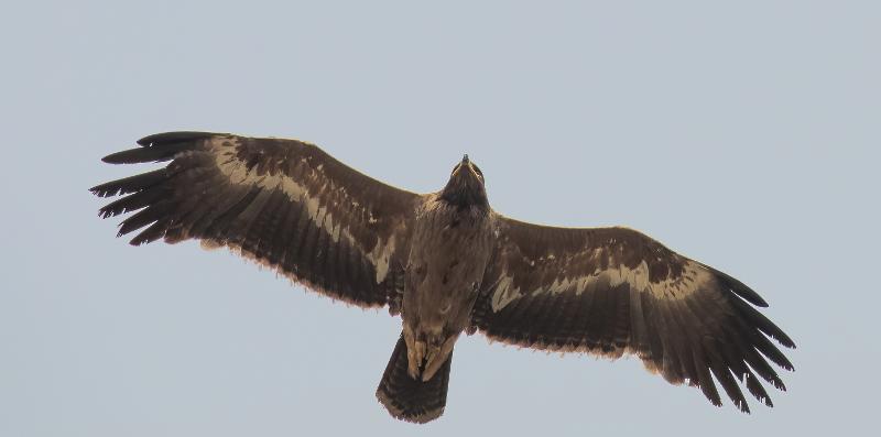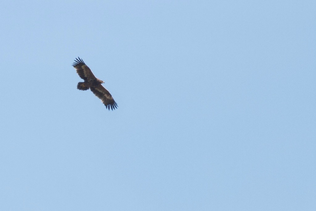 Beskrivelse: Ørnen blev set trække sent 4/5. Allered om morgenen ved 8-tiden dagen efter var den ude og vende syd for flagbakken. Jeg sad og ventede på Flagbakken - men meldingerne viste kun at fuglen bevægede sig langsomt mod SV. Jeg så den fra Hulsig Hede langt mod SV. Så satsede jeg og gik ind på Hedens SV-lige del uden at kunne se fuglen. Pludselig dukker den op 100 m foran med en snog el.lign i næbbet og flyver rimelig tæt forbi mod NØ. Jeg returnerede til Flagbakken og kunne nyde ørnen igen - den trak såmænd forbi da jeg havde sat mig til rette - dejlig oplevelse.