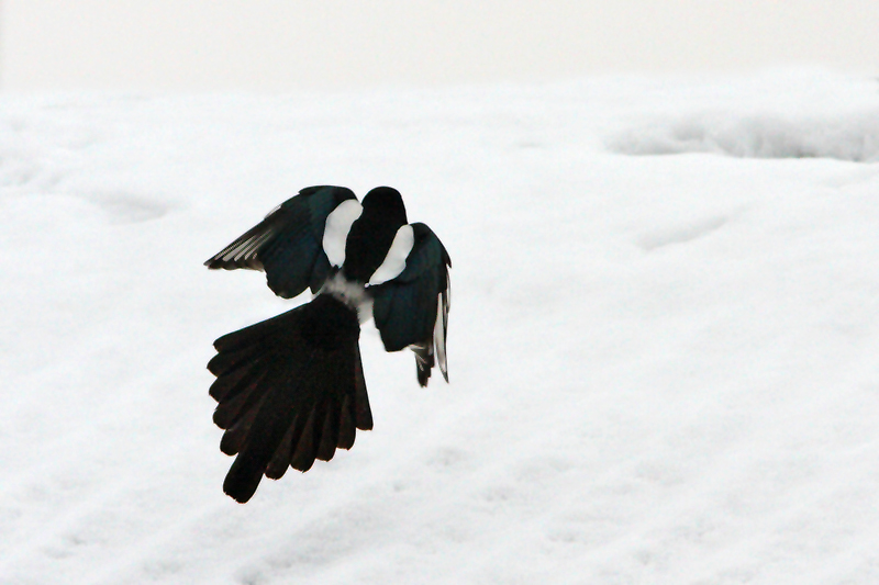 Smukt billede med et kunstnerisk touch som man sjældent fanger i nærbilleder! Afstanden og det næsten overdrevne forgrund gør fuglene lige tilpas "virtuelle" i sneen.