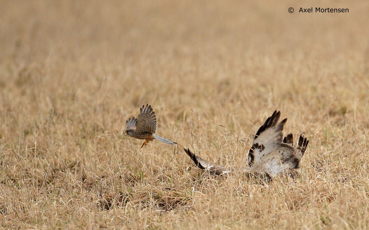 Beskrivelse: Den lokale tårnfalk er meget utilfreds med, at fjeldvågerne er ankommet til deres overvintringslokalitet.