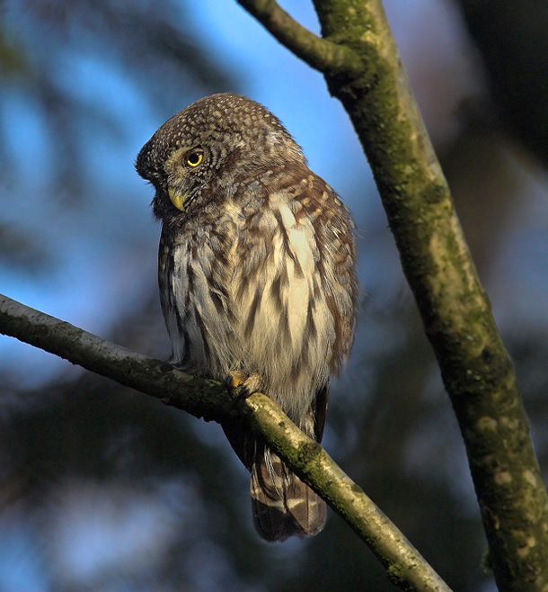 Jeg havde ikke set Spurveugle før og forestillede mig den som en lille slags dekorativ kogle eller statisk figur,som man med to fingre forsigtigt kunne flytte over på en anden,lidt bedre gren efter et par timer.