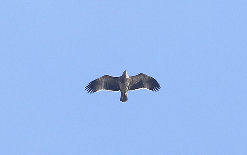 Jeg tror af mine kursister kan skrive under på, at der skulle ydes det allerbedste imod hvide skyer og modlys, hvor bestemmelsen stort set kun kunne gøres på baggrund af silhuetten, og ørnen kredsede i en artsblandet skrue på 20-25 individer af mus- og hvepsevåger, rød glente (den er ikke så svær) og rørhøg.